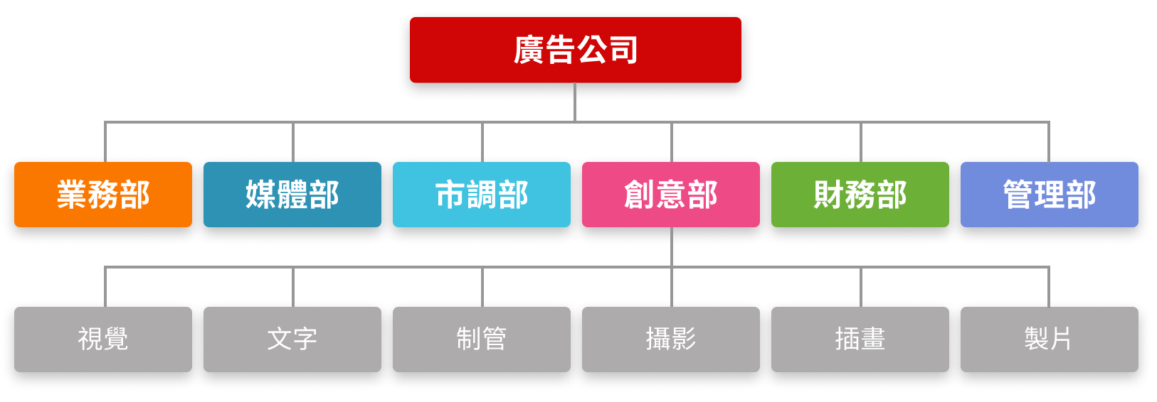 綜合廣告代理業以動態視覺設計表現及掌握廣告媒體製作服務為主,其公司組織結構如下圖所示,主要工作可分為業務部、媒體部、市調部、創意部、財務部、管理部,其中業務部及創意部可說是廣告公司最主要的運作組織。