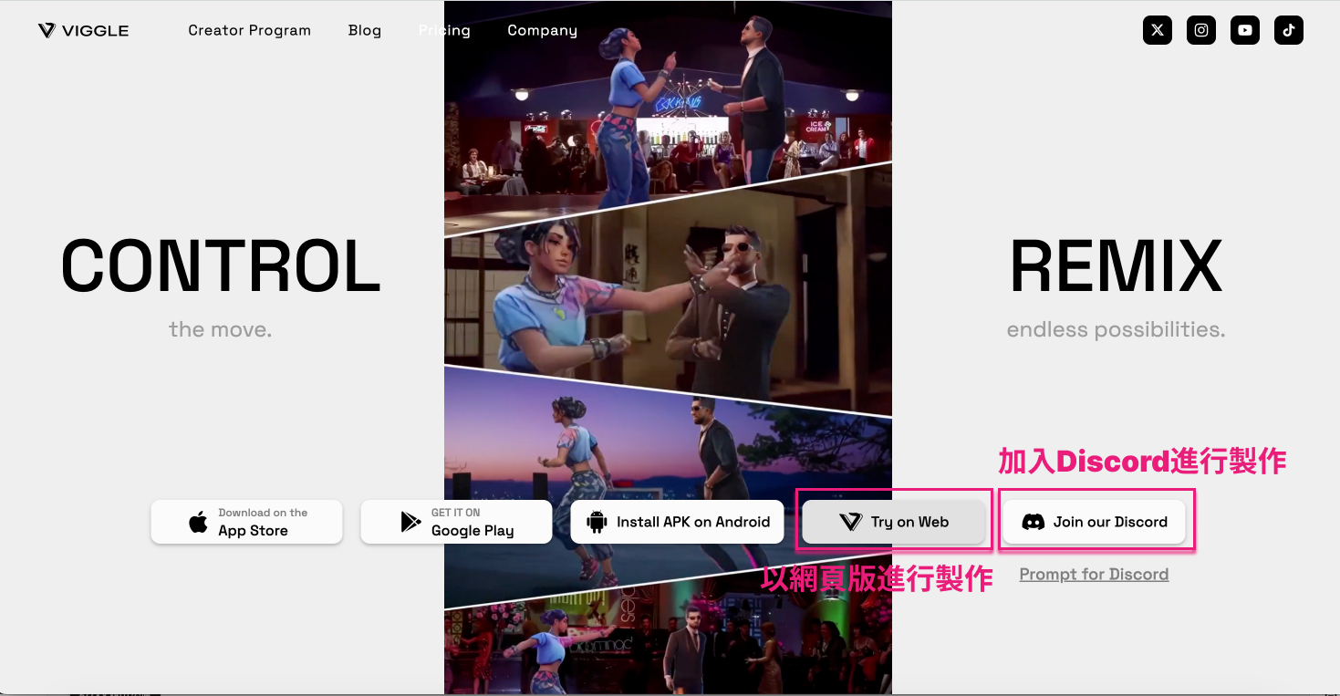 - 網頁版: 進入 Viggle AI 網站,點撃「Try on Web」,登入google帳號即可在網頁版使用。