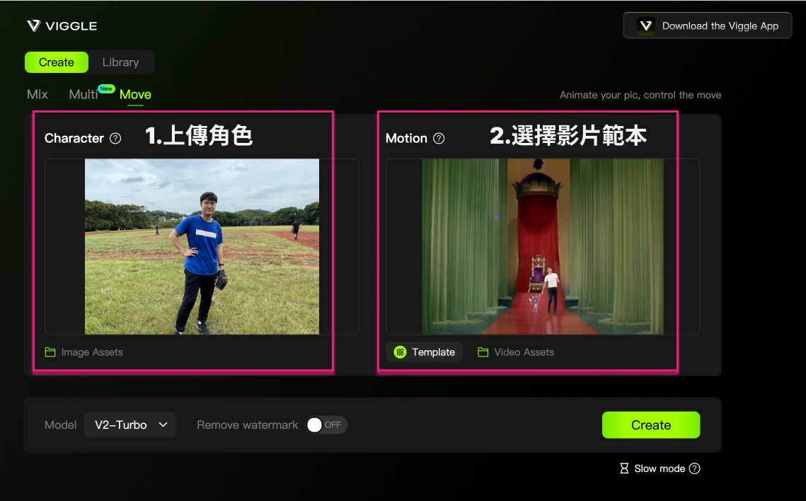 請分別以Mix、Multi、Move三種模式製作,製作完畢,下載影片,上傳雲端空間,請自行開 Viggle AI|作業資料夾,上傳作業