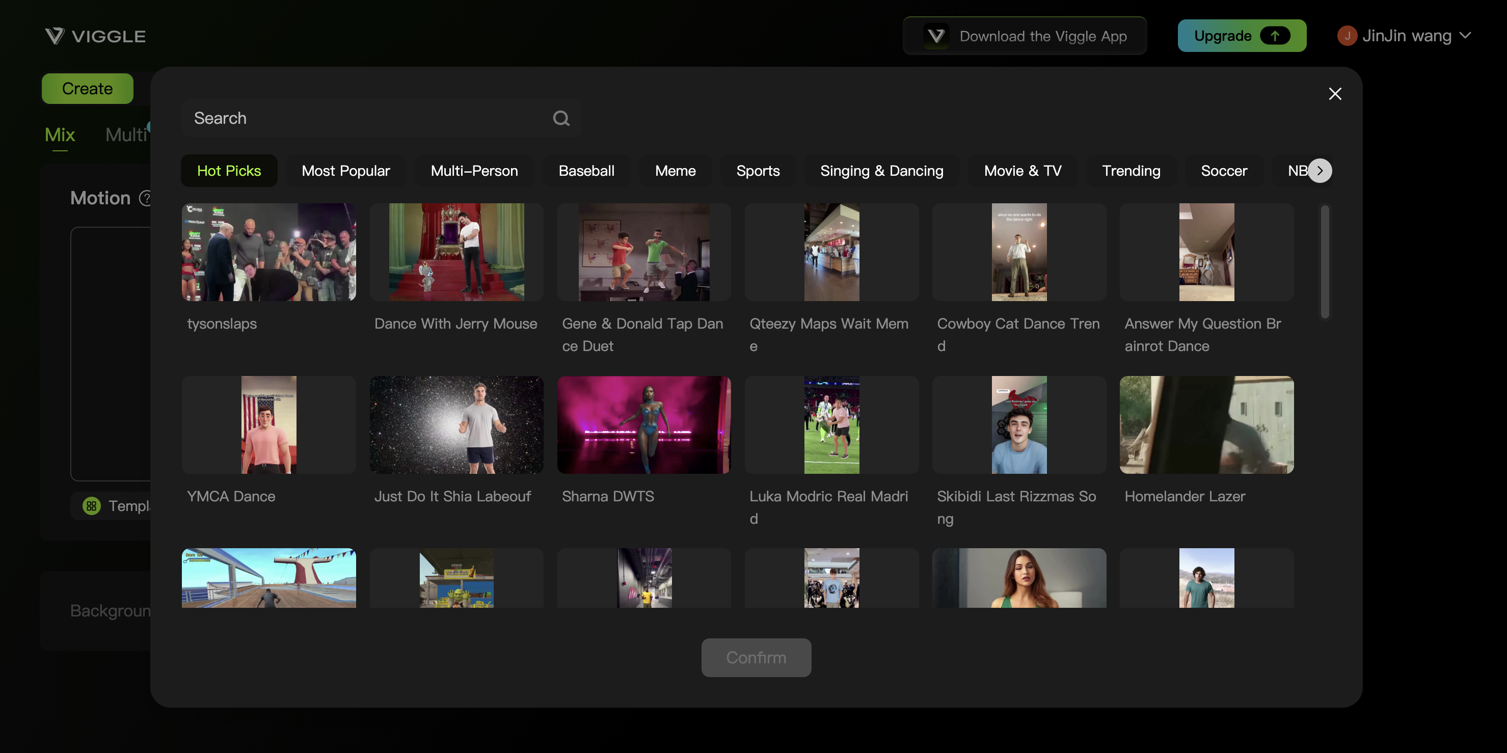 上傳人物圖片和動態視頻,Viggle 可以在保持原有背景完整的情況下將動態視頻中的動作及表情轉移到上傳的人物圖片上。