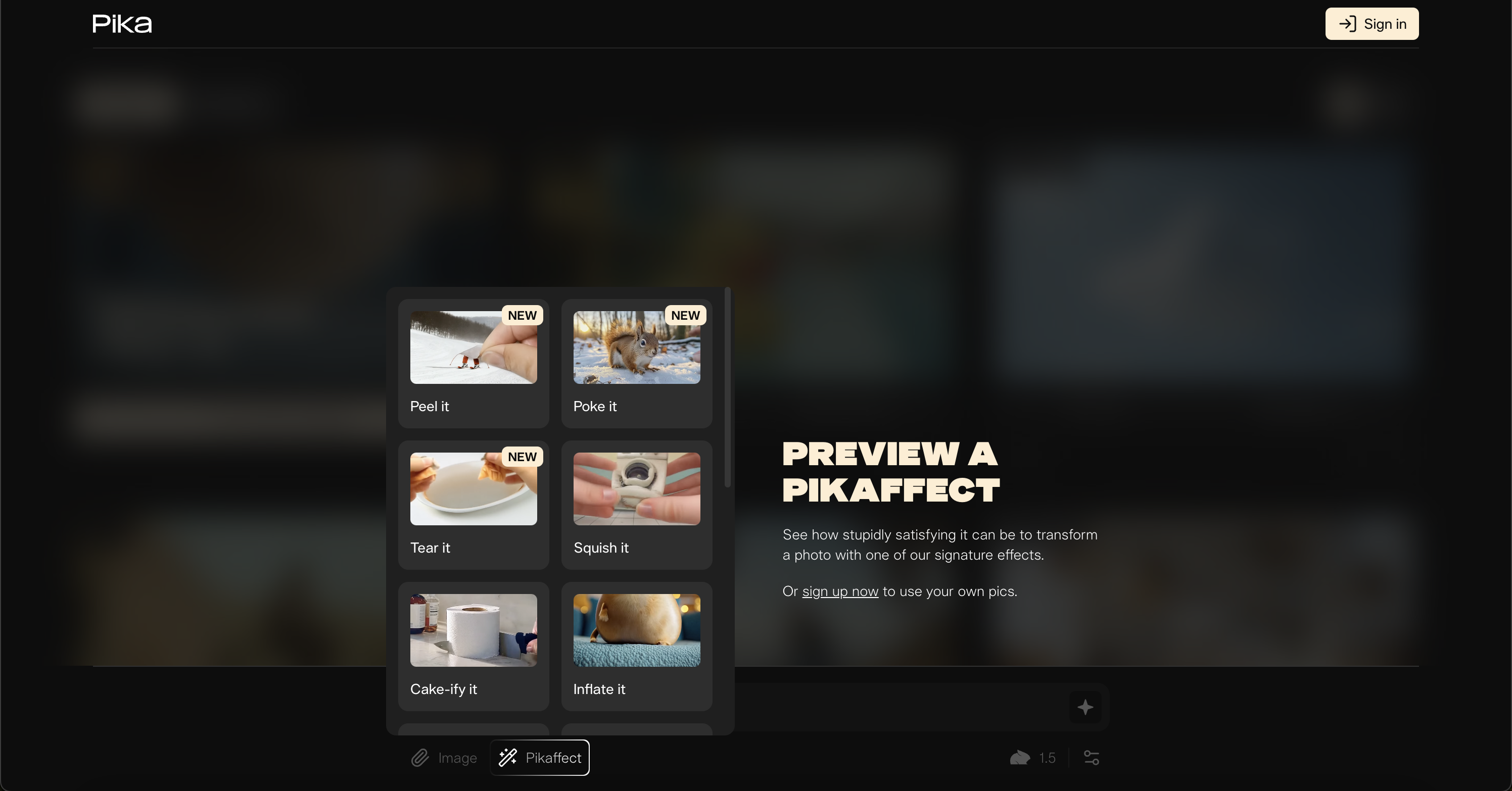 Pika art 算是一個線上AI工具,能夠將靜態圖片轉換成動態影片,並套用各種趣味特效,例如揉捏、壓扁、爆炸、漂浮、砍半、融化等等。而且 Pika art 上手門檻極低,就算不懂語法指令同樣都能快速上手。像是可以利用 Pika art 網站直接製作出雙手捏扁的視覺特效,能夠將照片內的人物像是黏土一樣捏扁,超級神奇又有一股很搞笑又療癒感。