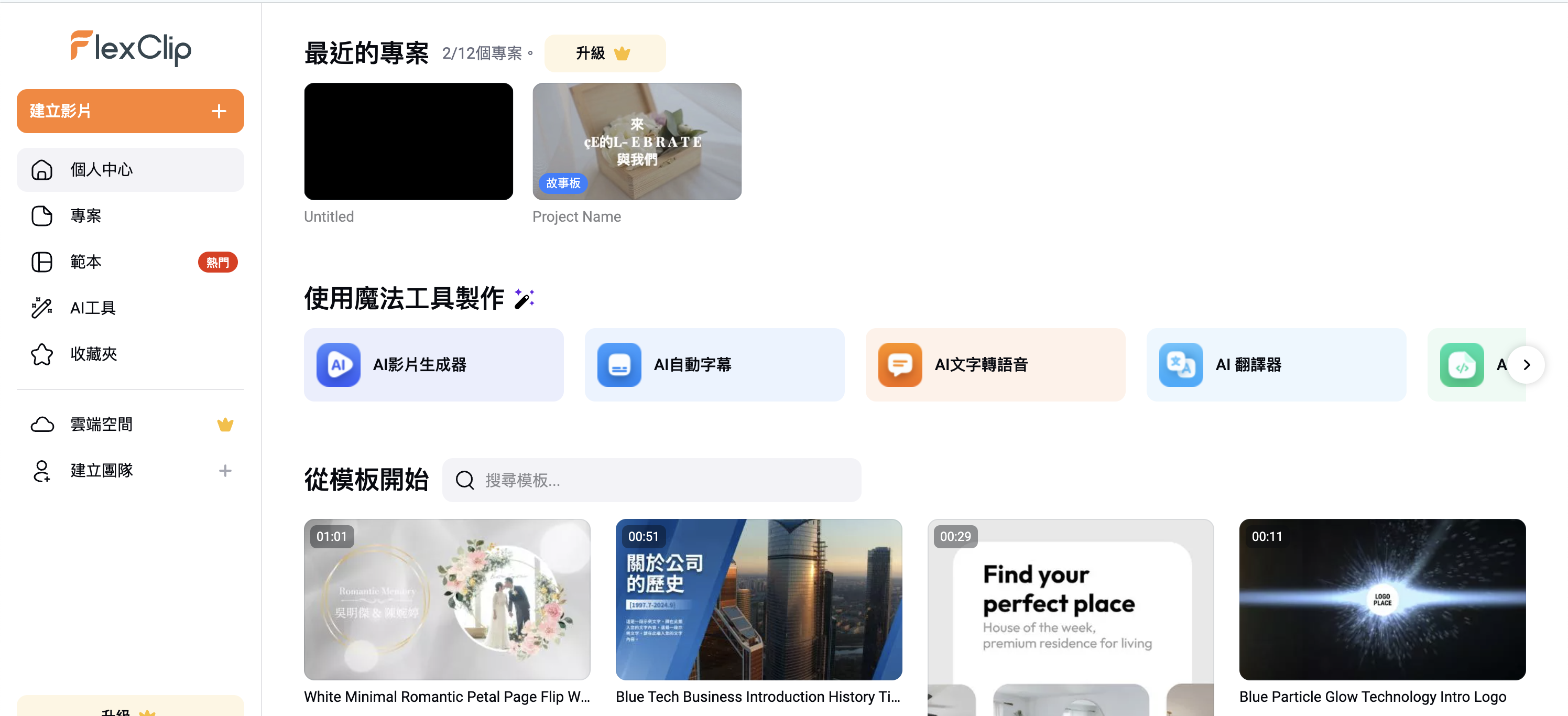 FlexClip線上人工智慧AI生成影片製作工具,幫你輕鬆創建、編輯和生成各式各樣的高質量AI影片、動畫、電影和短影片,無需任何經驗!你可以從基於AI人工智慧技術和算法生成的優質影片範本中選擇一個開始AI影片創作;或是輸入簡單的語句、想法或完整的故事,讓FlexClip內置的AI人工智慧內核直接幫你把整個影片都生成了!無論你是需要一個AI影片來作為商用、廣告或品牌宣傳,還是分享生活,亦或是實現新奇的多媒體創意,FlexClip免費AI影片自動生成器都提供了全套的技術和素材支援,包括:AI提取字幕、文轉語音、文轉影片、文轉圖片、語音降噪、圖片去背景,以及數百萬的圖片&影片資源,讓你即時擁有你想要的影片!選擇AI影片範本開始,添加精美、酷炫的文字來突出、提示影片的重點內容,選擇應景的背景音樂、特效、片頭和片尾即可! AI能幫你把影片自動上好字幕,生成真人旁白、配音、繪圖,或者一鍵把影片轉錄成其他語言的影片,無需任何剪輯技巧,你照樣能用FlexClipAI影片生成器製作出超吸睛的視覺效果。