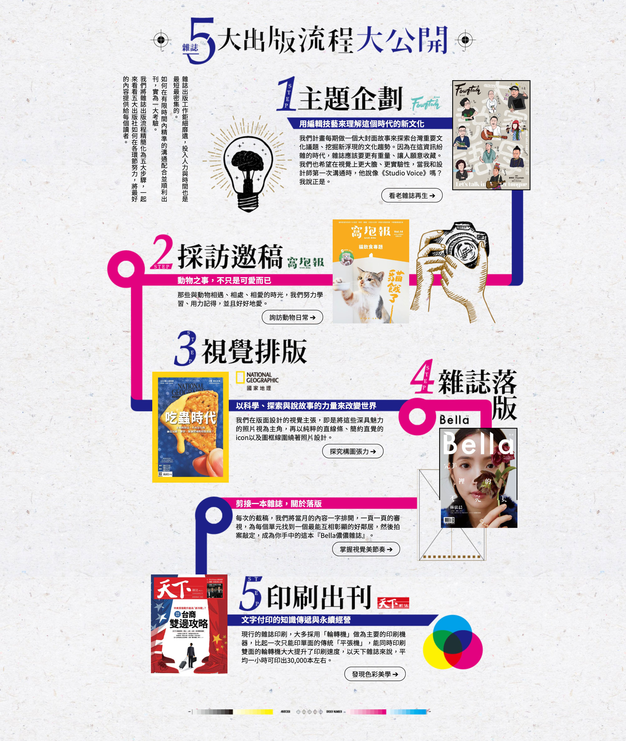 - 出版 通常雜誌的出刊週期大都分為:週刊、旬刊、雙週刊、半月刊、月刊、雙月刊、季刊、半年刊、年刊。大多數的雜誌會在封面上標示出版的日期,並且採用彩色印刷,封面通常為軟皮封面。