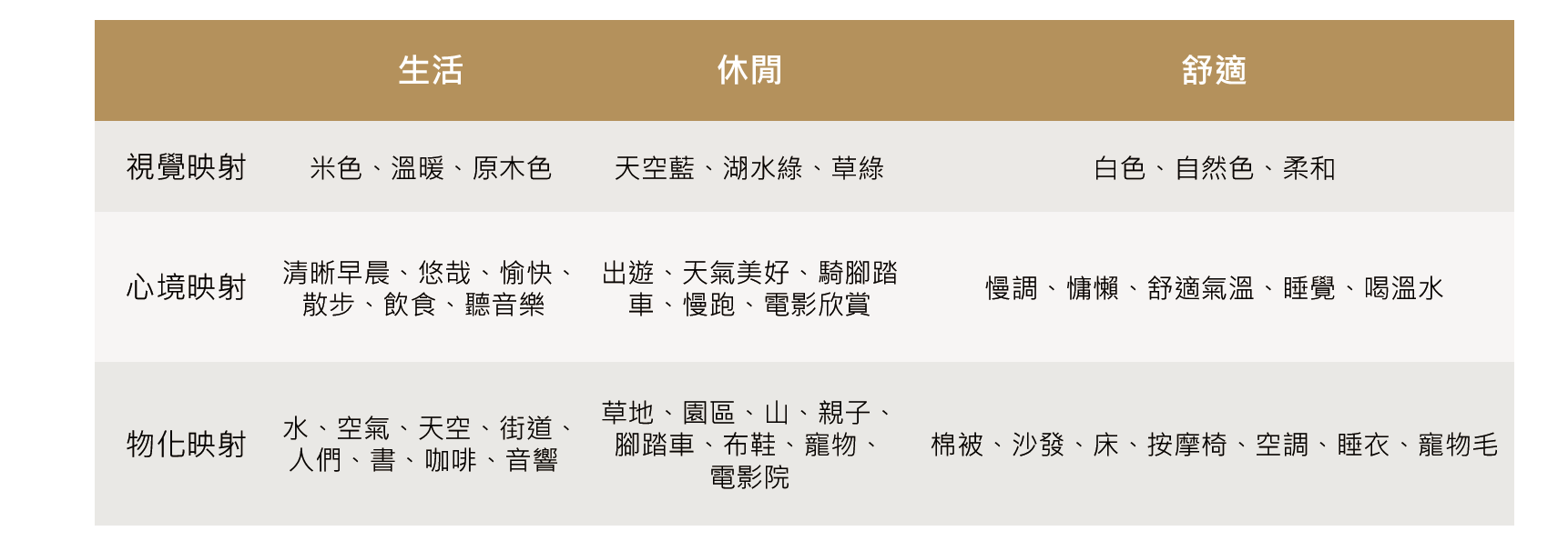 心境映射:可以理解為聯想到的心境感受,比如:品質——高端、貴重、稀有;簡潔——空曠、乾淨、整齊;友好——溫暖、親切、舒服等。