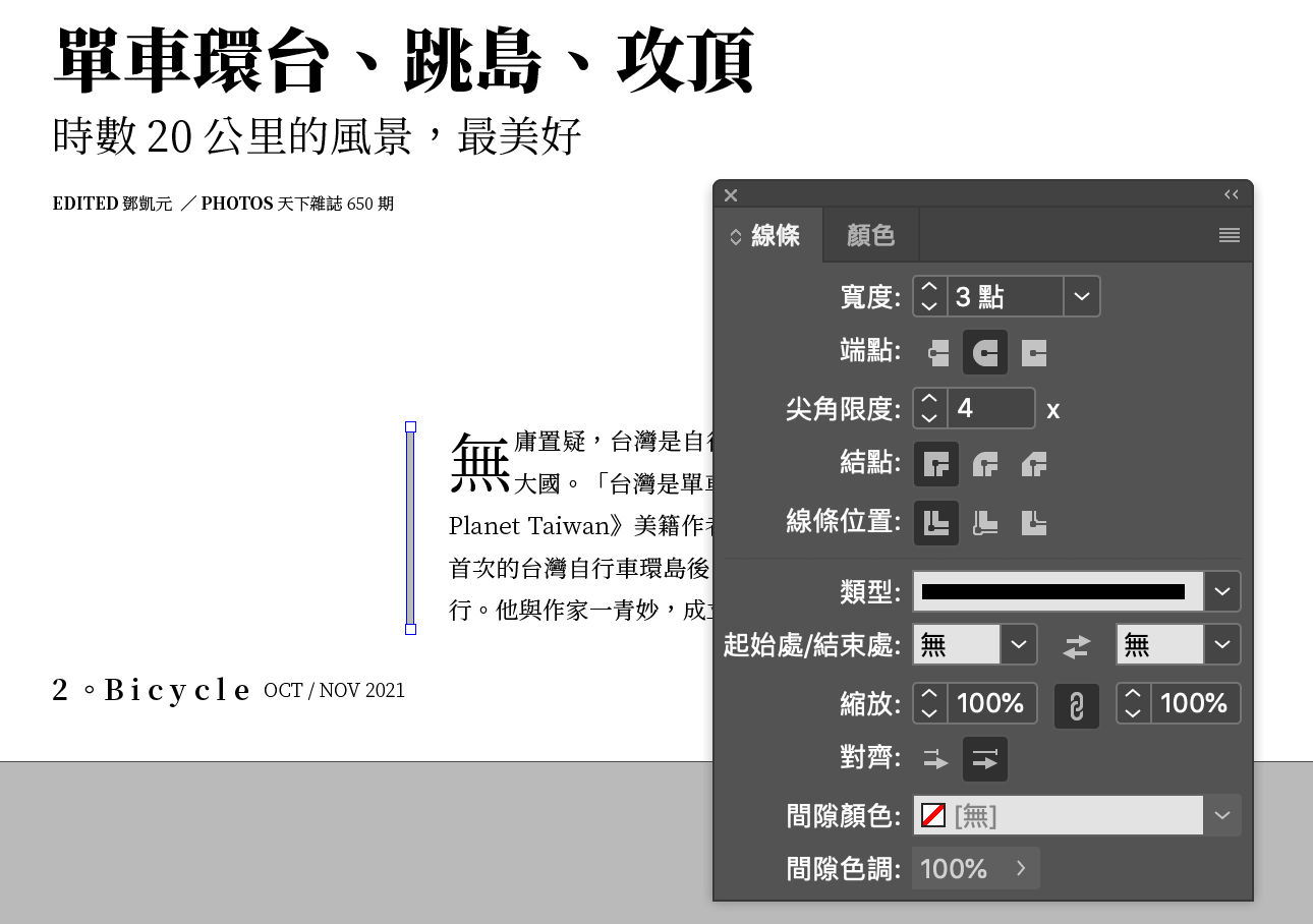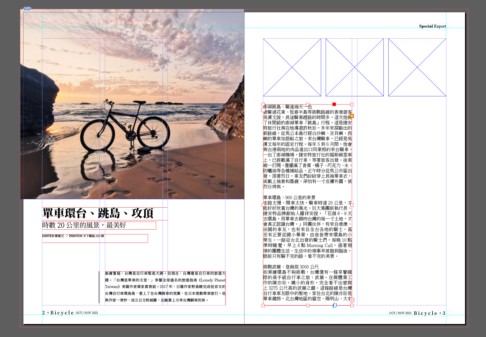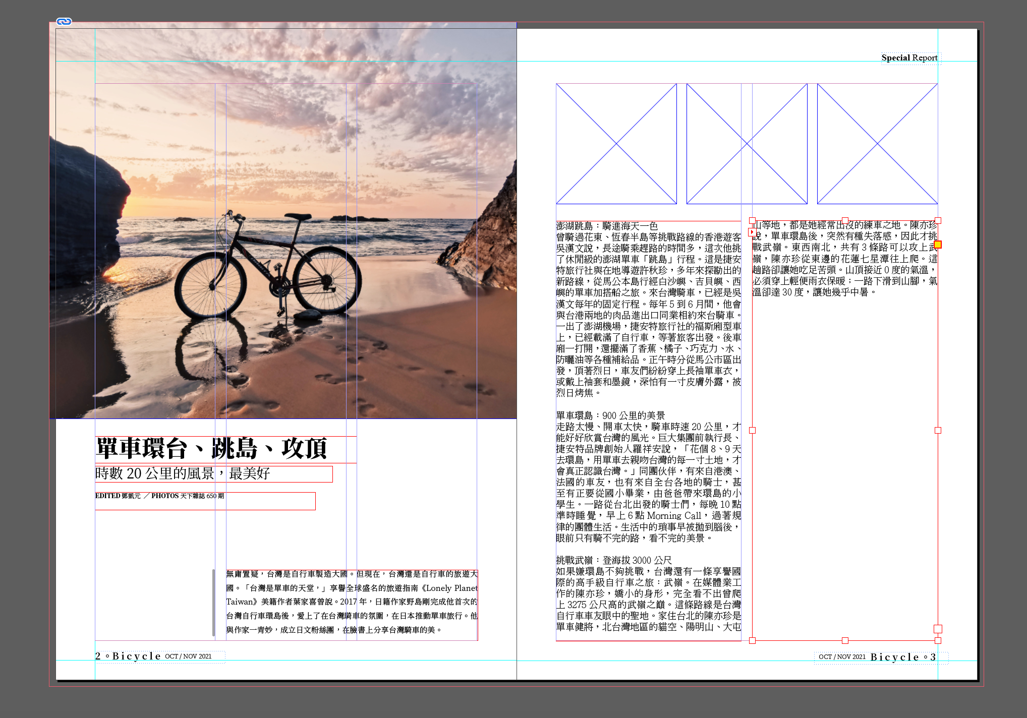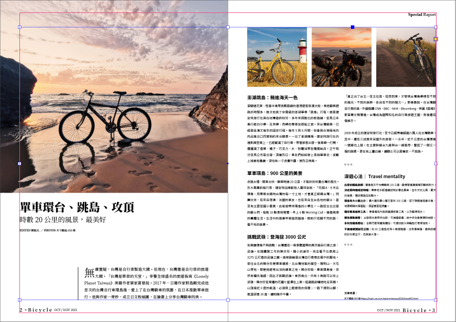 本單元以上課範例: 單車環台、跳島、攻頂 中的文字及圖片進行編排,供上課練習用,課後作業則以自己的期末刊物內容為主進行製作。