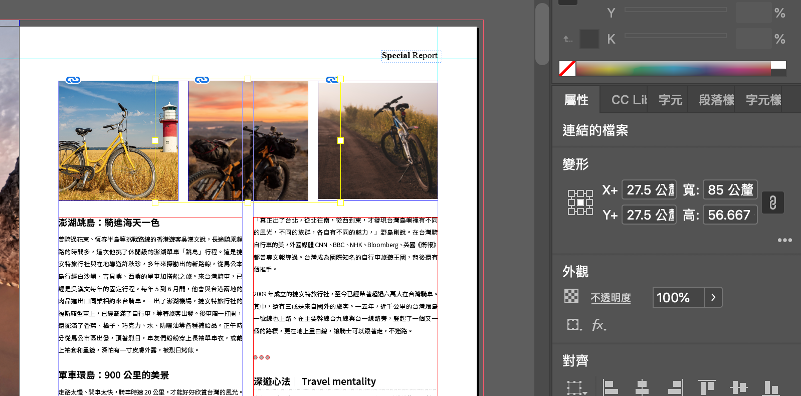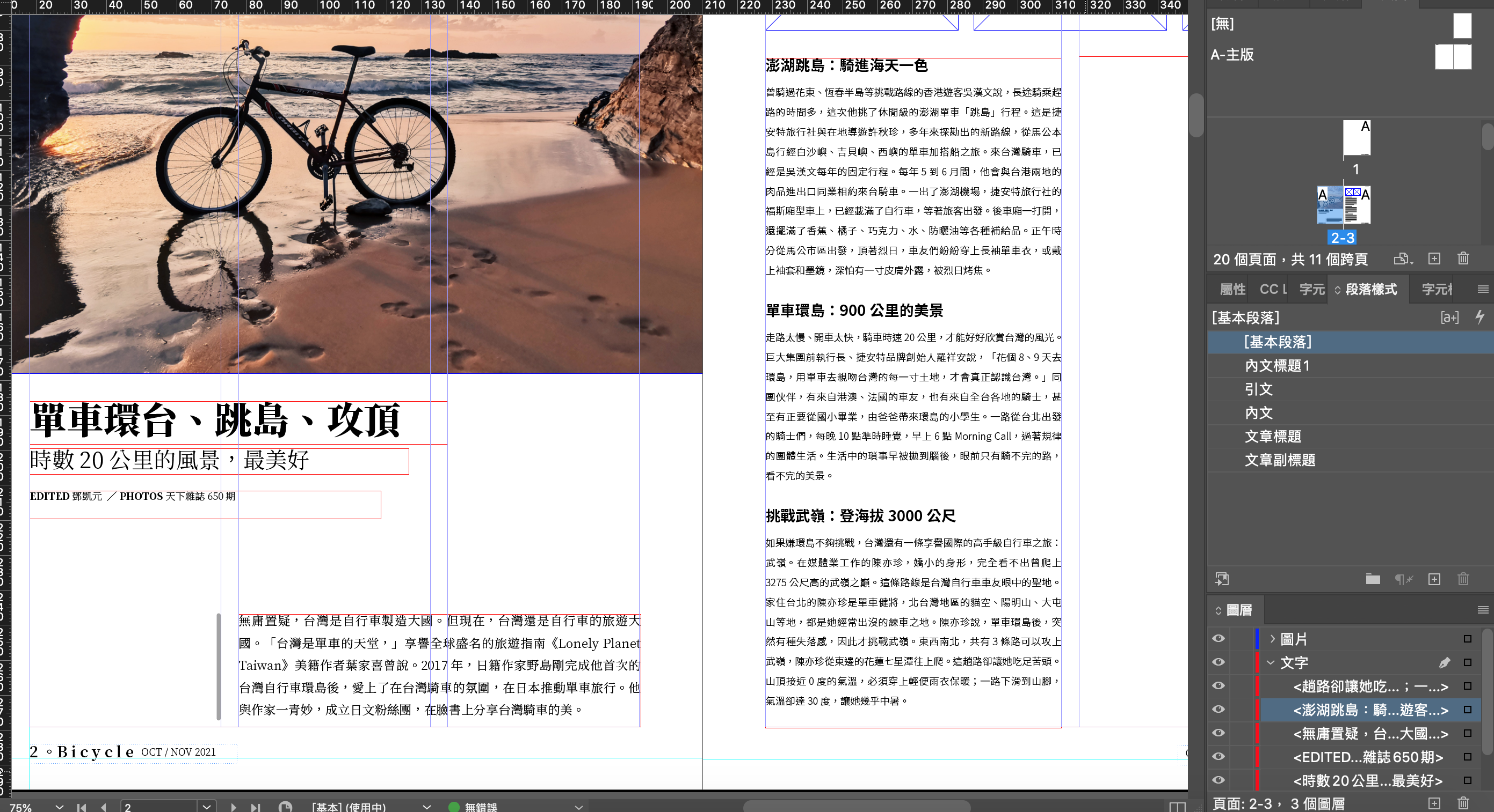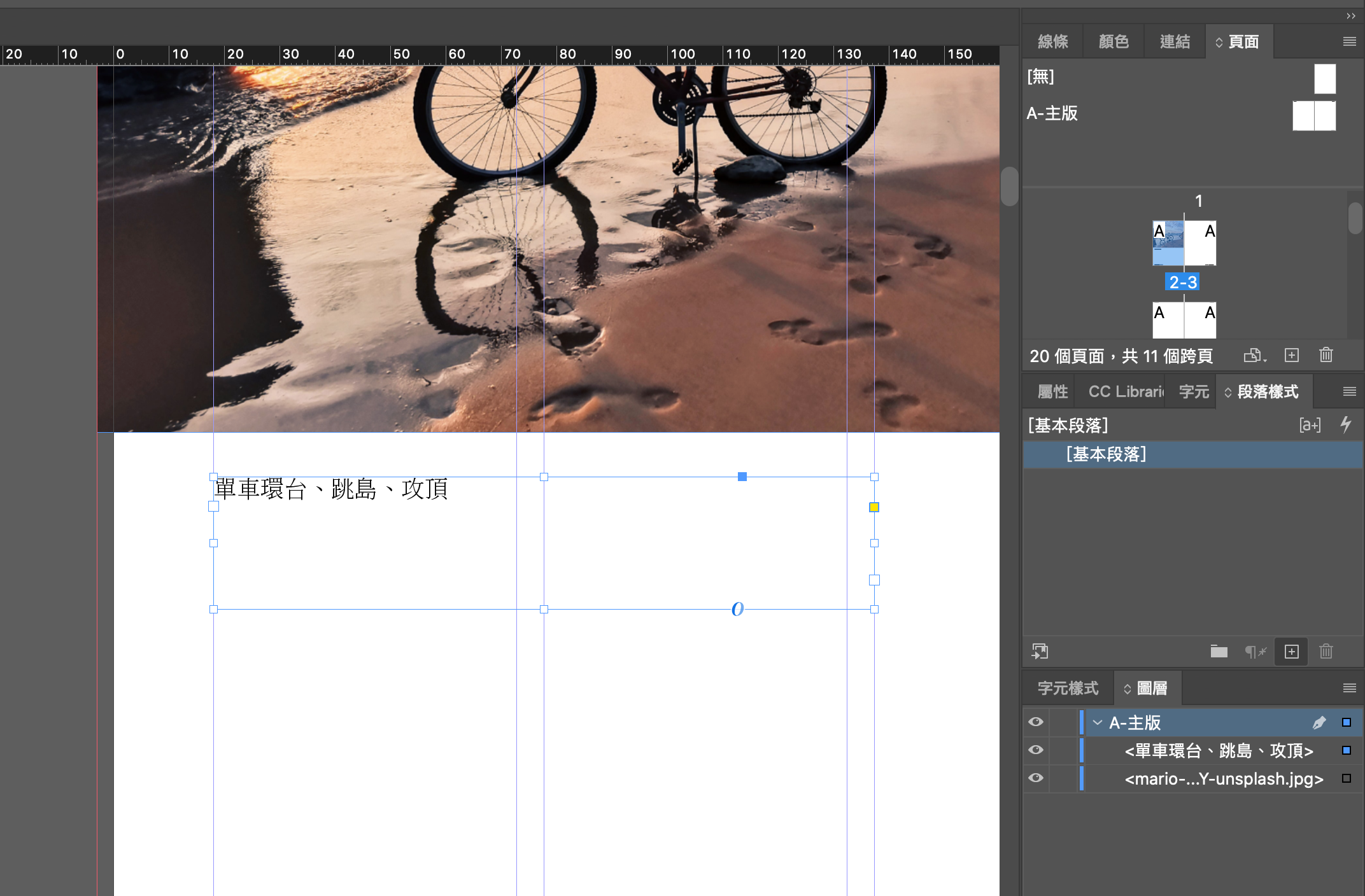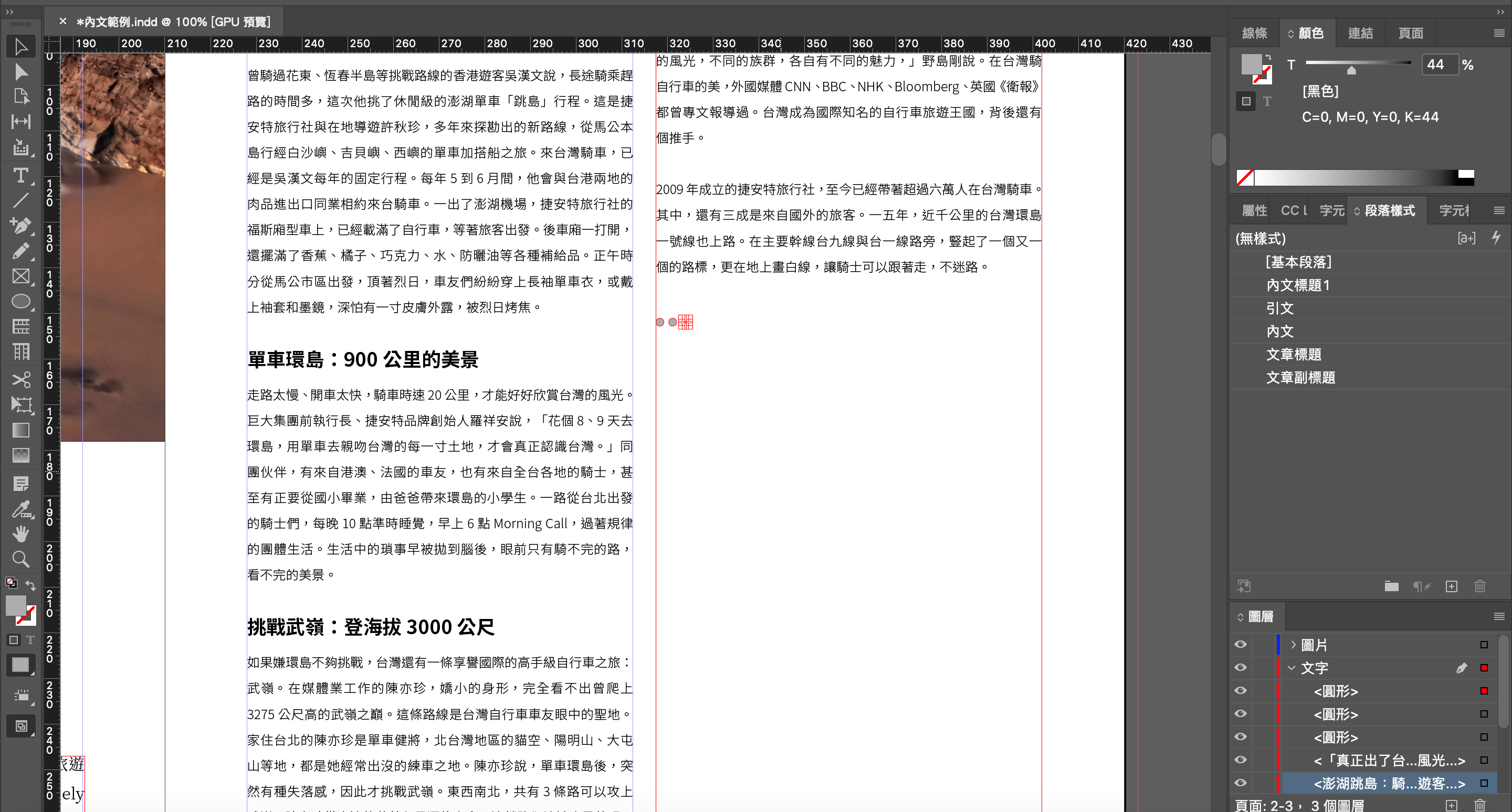 本單元以上課範例: 單車環台、跳島、攻頂 中的文字及圖片進行編排,供上課練習用,課後作業則以自己的期末刊物內容為主進行製作。