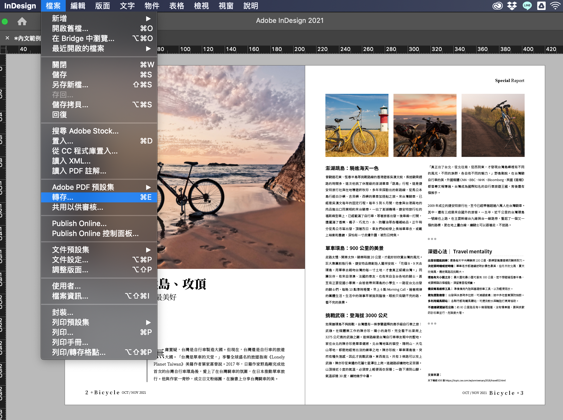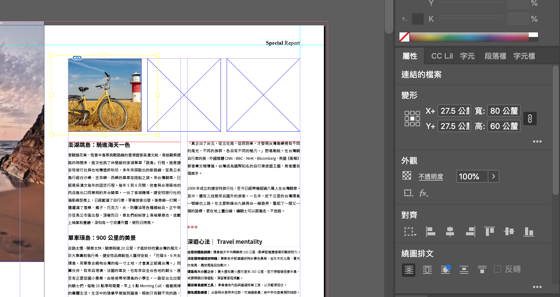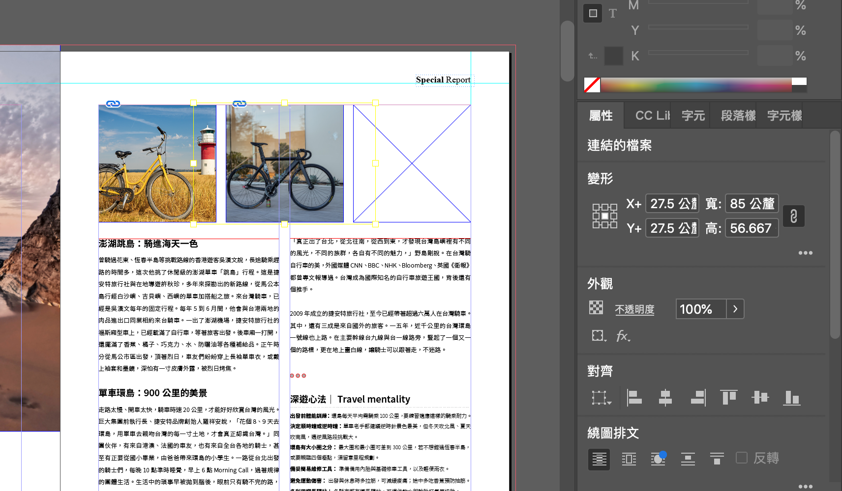 本單元以上課範例: 單車環台、跳島、攻頂 中的文字及圖片進行編排,供上課練習用,課後作業則以自己的期末刊物內容為主進行製作。