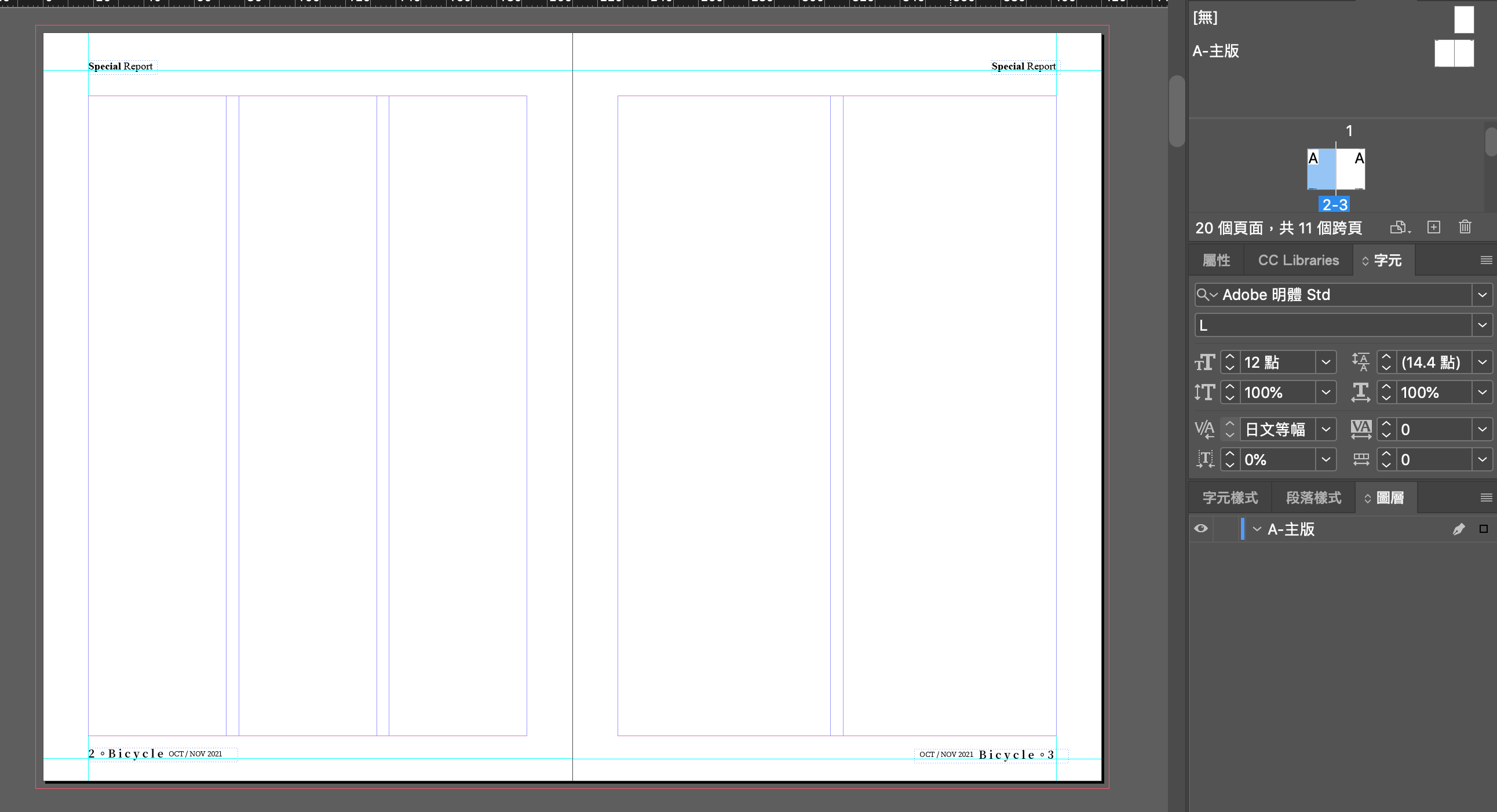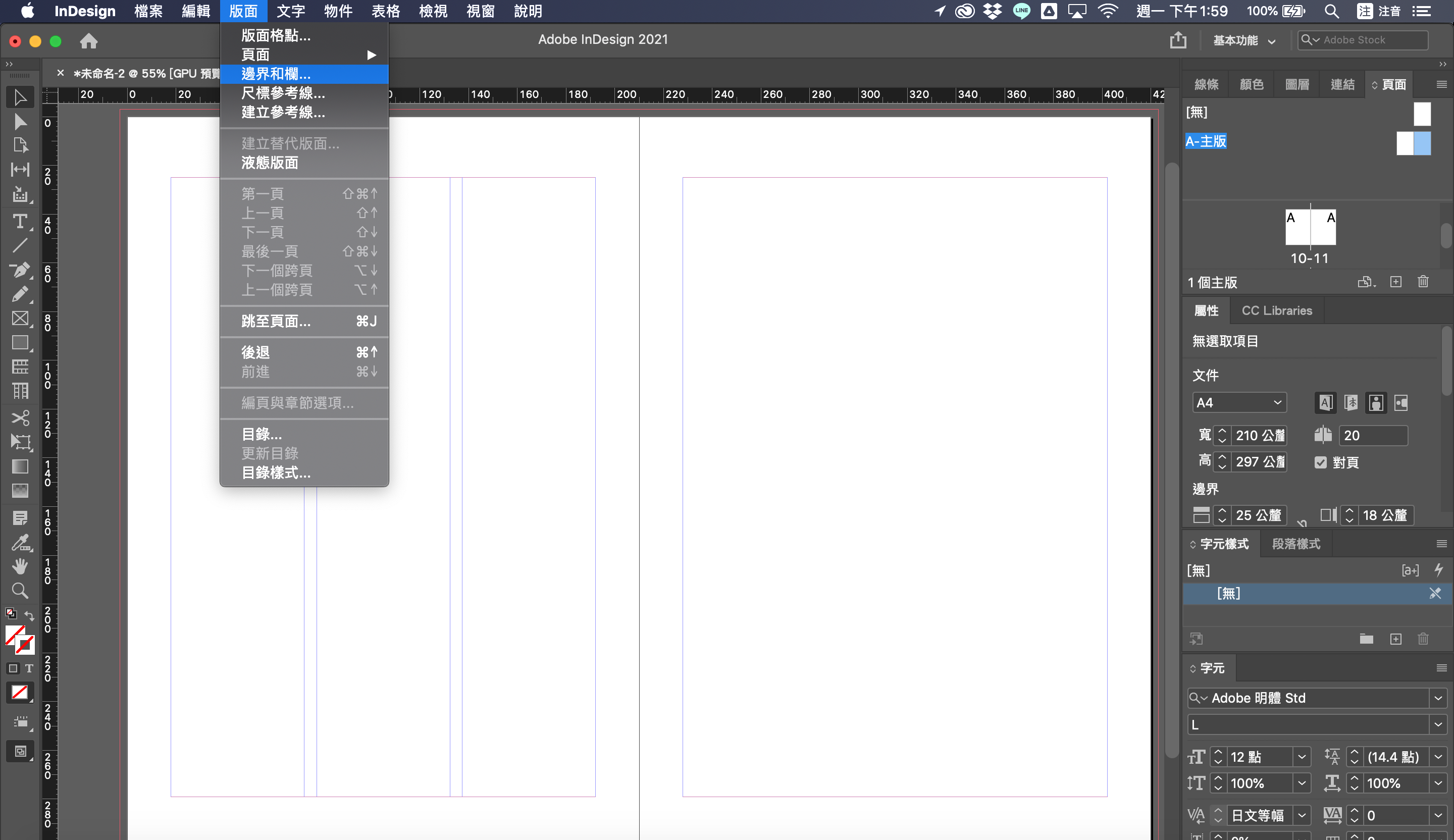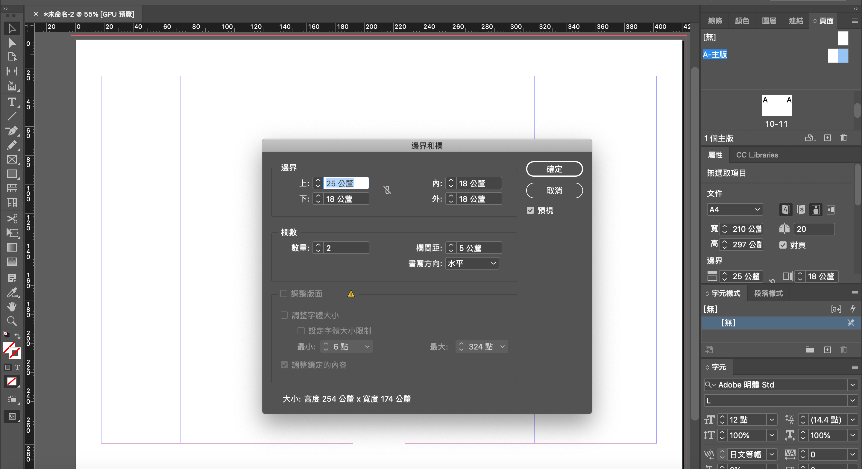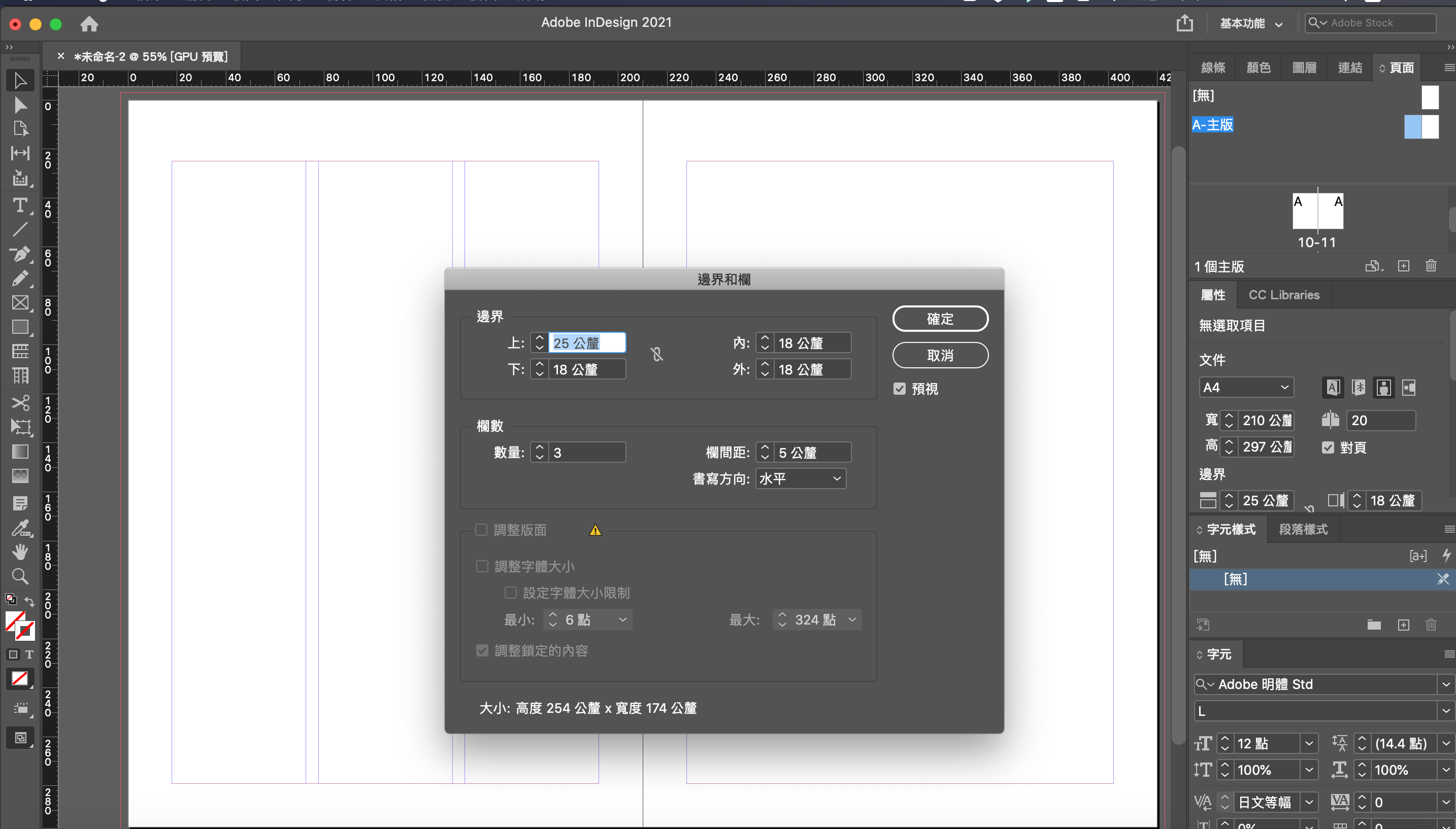 - 點選主版A,並在左側先行設定『邊界與欄』。 邊界數值與欄位數值,請依刊物需求設定,本範例左側設定為三欄。邊界數值則為版心的範圍。