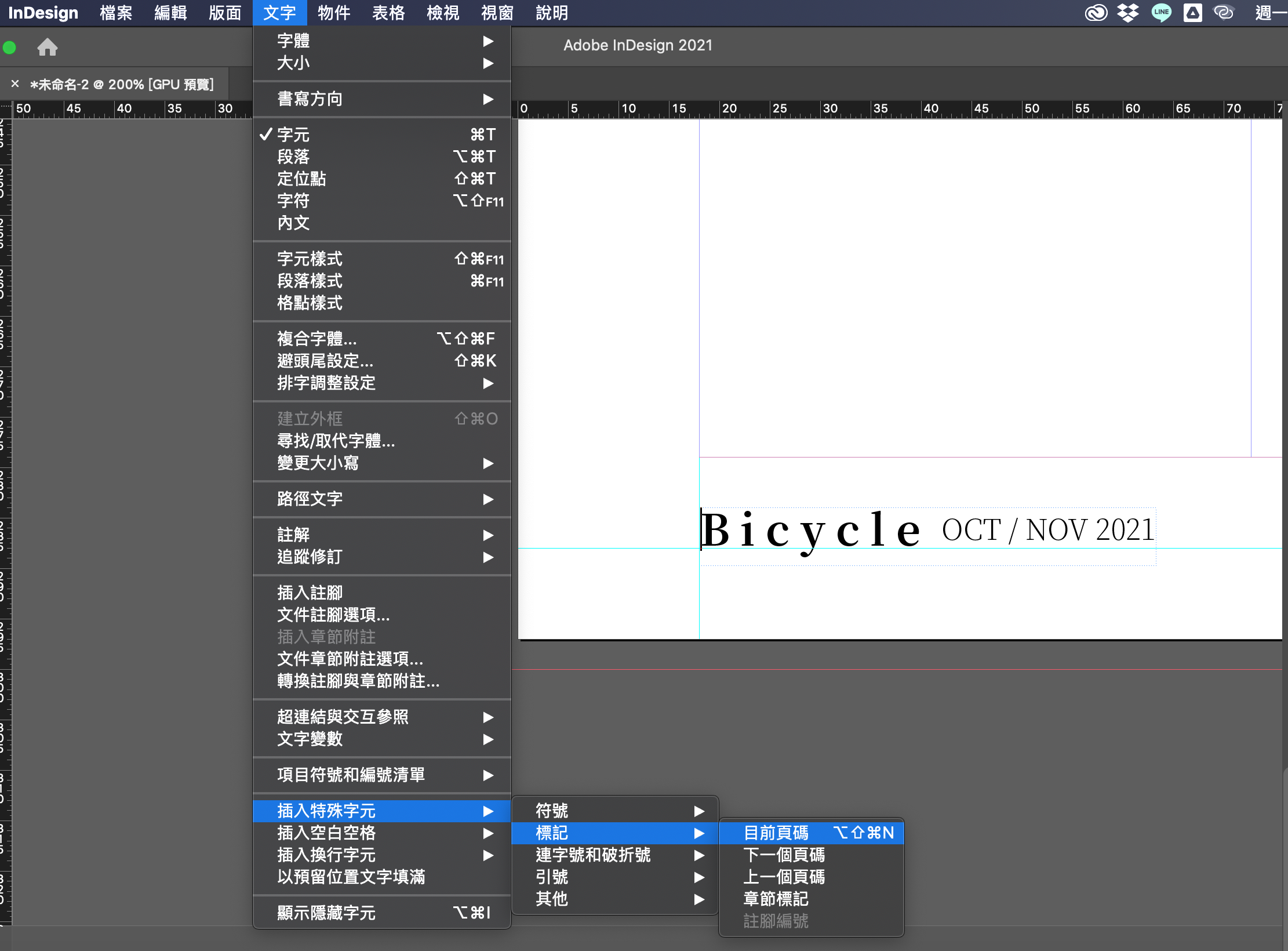 - 建立頁碼 『文字』>『插入特殊字元』>『標記』>『目前頁碼』