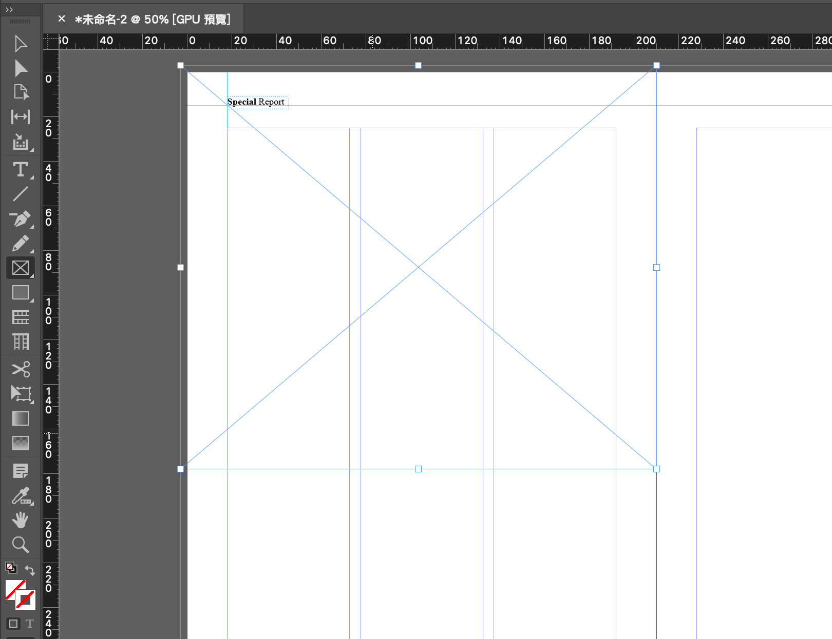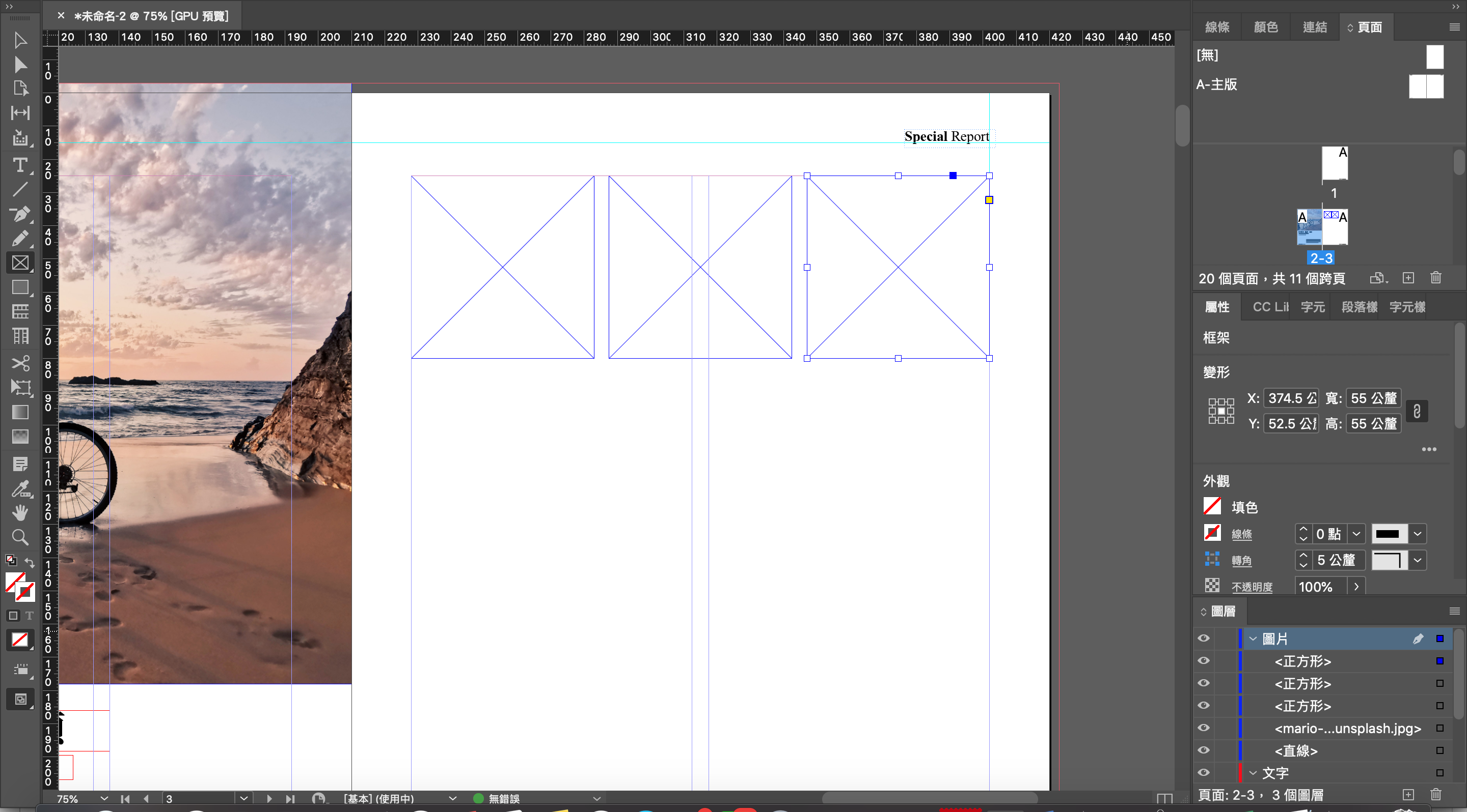 - 在左側以『矩形框架工具』拉出一約2/3出血範圍,置入圖片