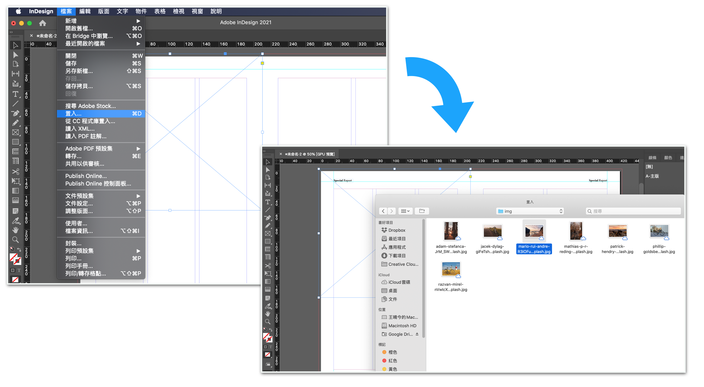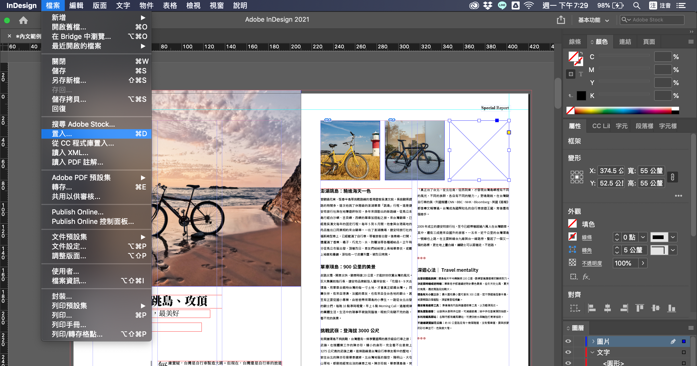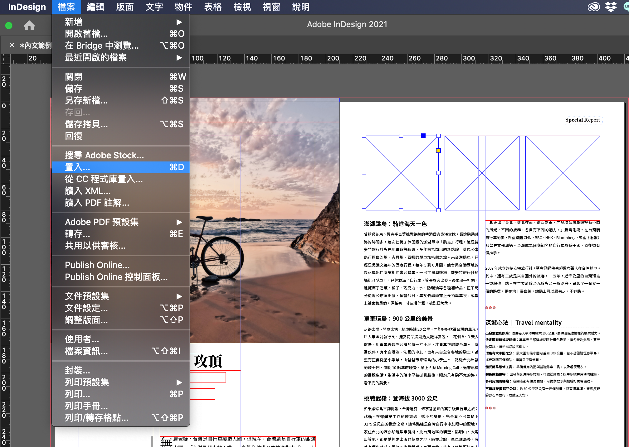 - 選取『矩形框架』>『檔案』>『置入』>選取『圖片』,放置於『矩形框架』位置。