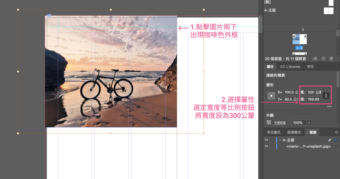 - 將置入的圖片,點擊後,等比例縮小,設為寬度300公釐。