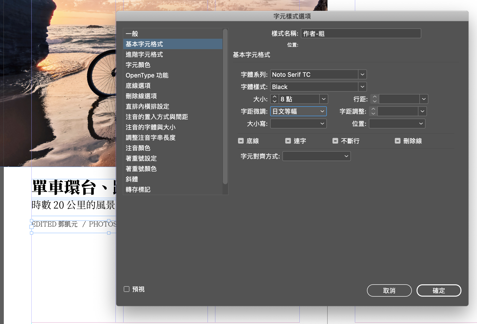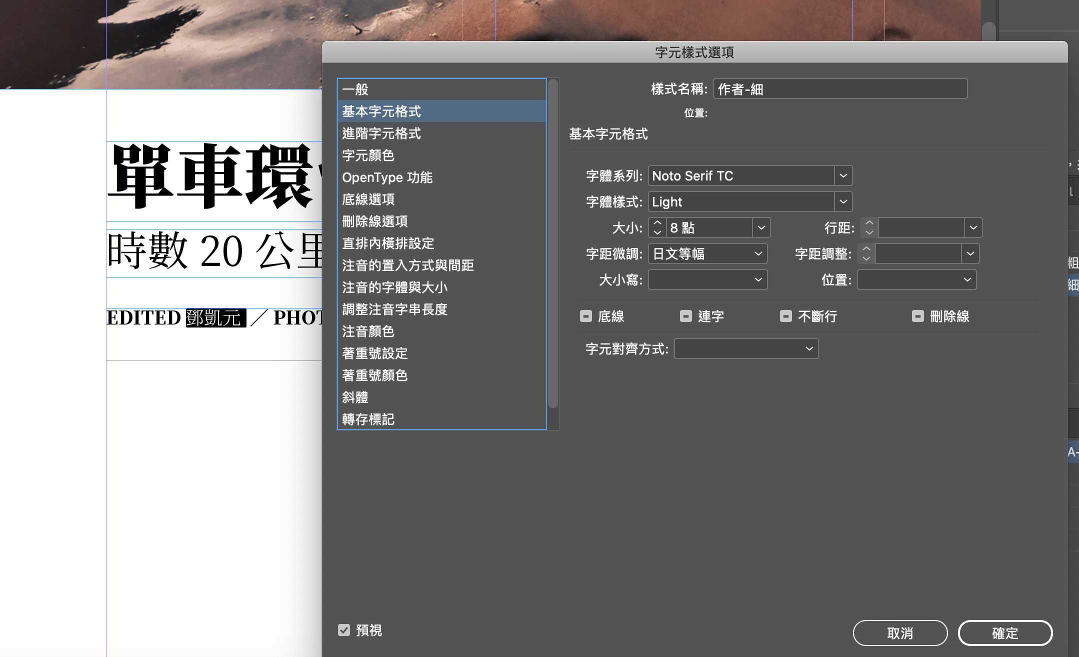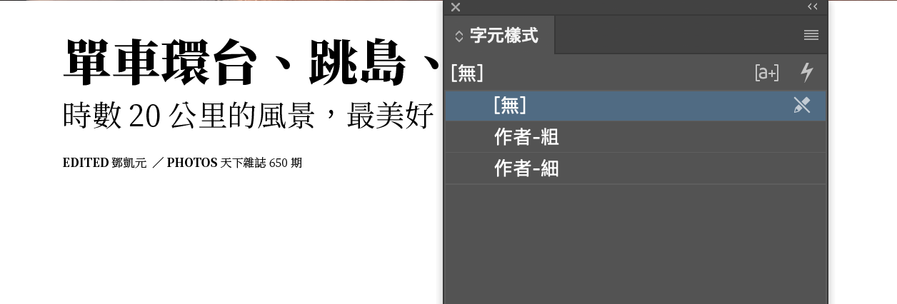 - 在『字元樣式』中產生『作者-粗』、『作者-細』兩種字元樣式。利用些微的粗、細,展現細緻的設計差異感。