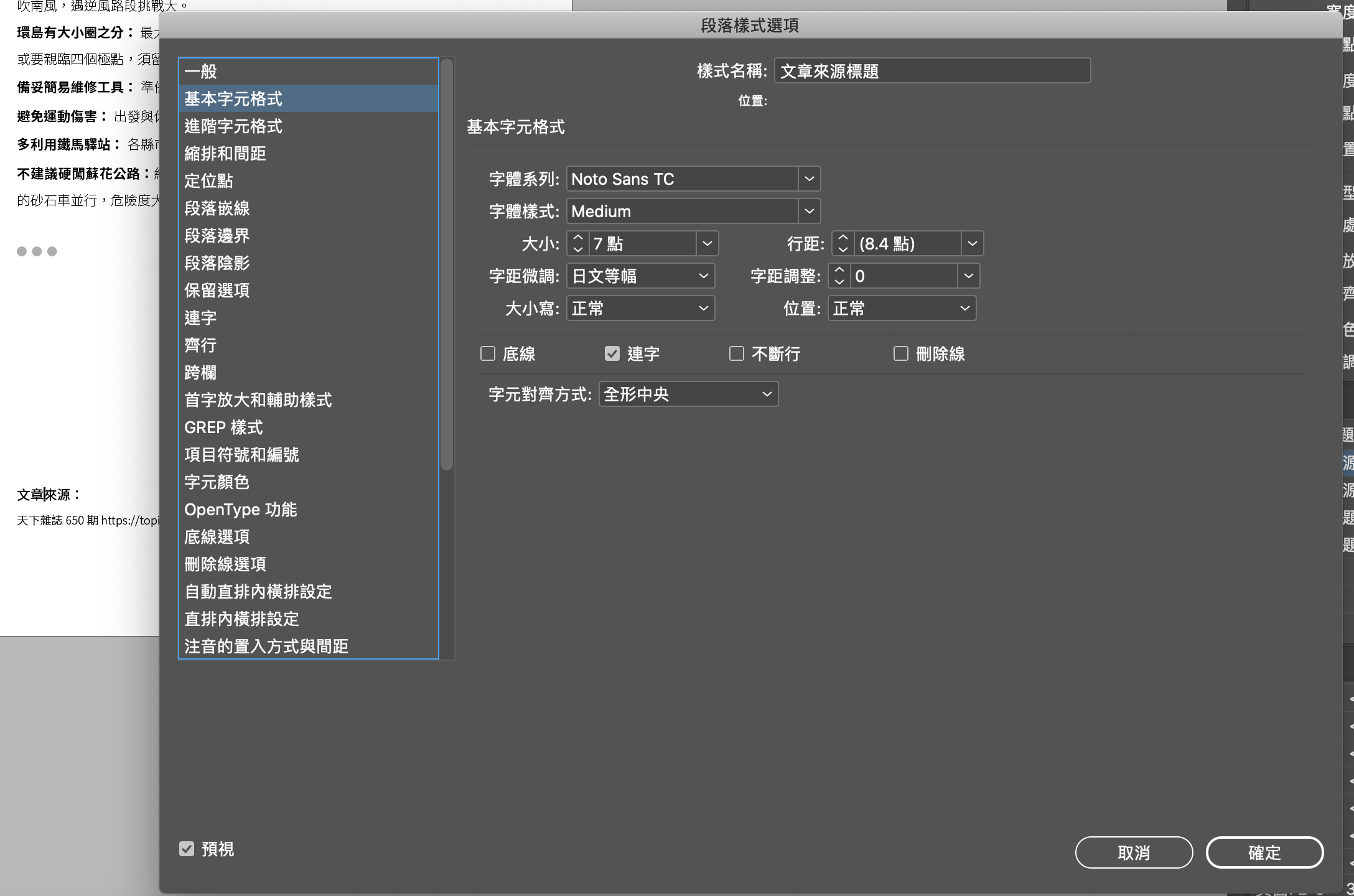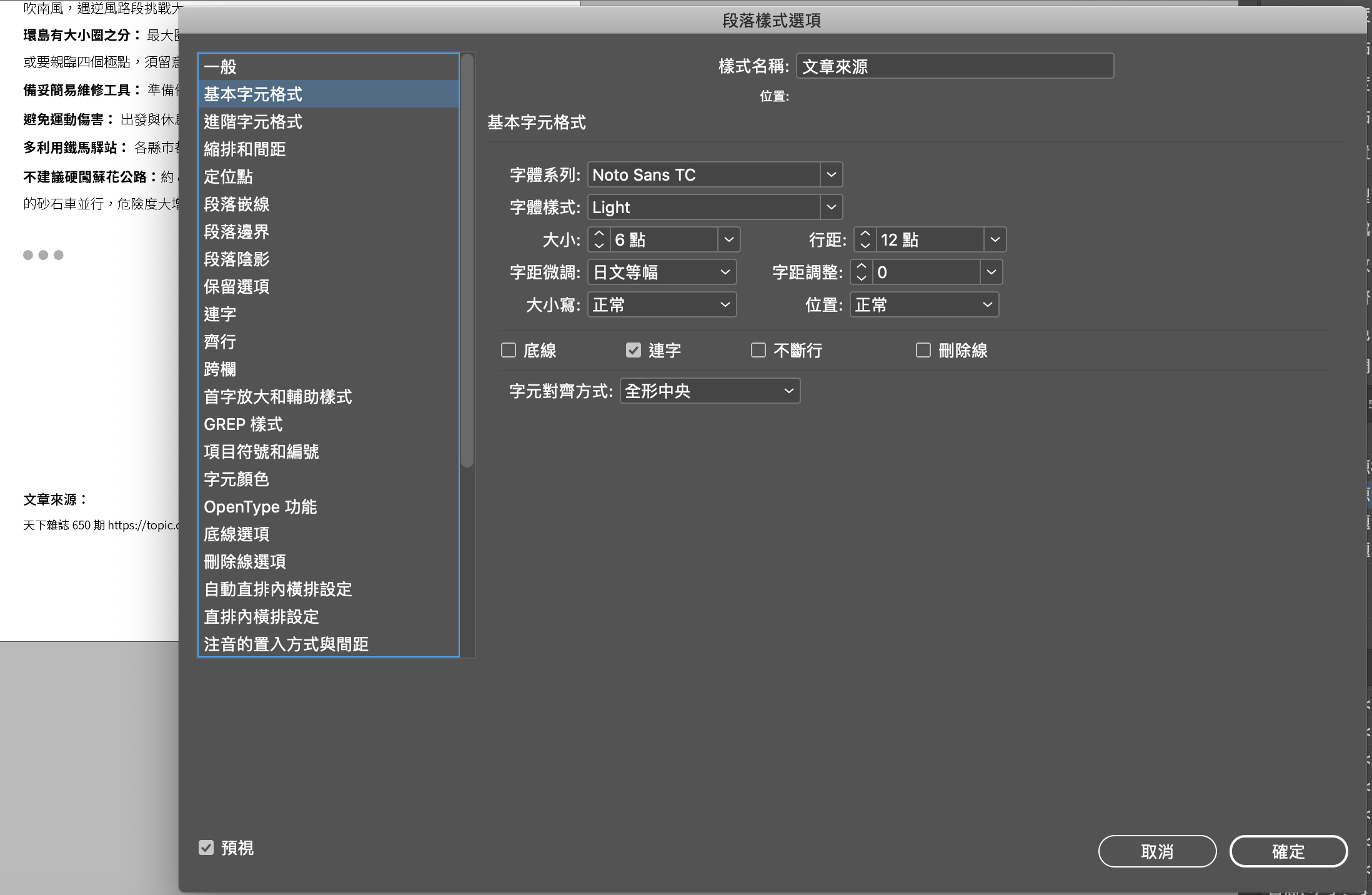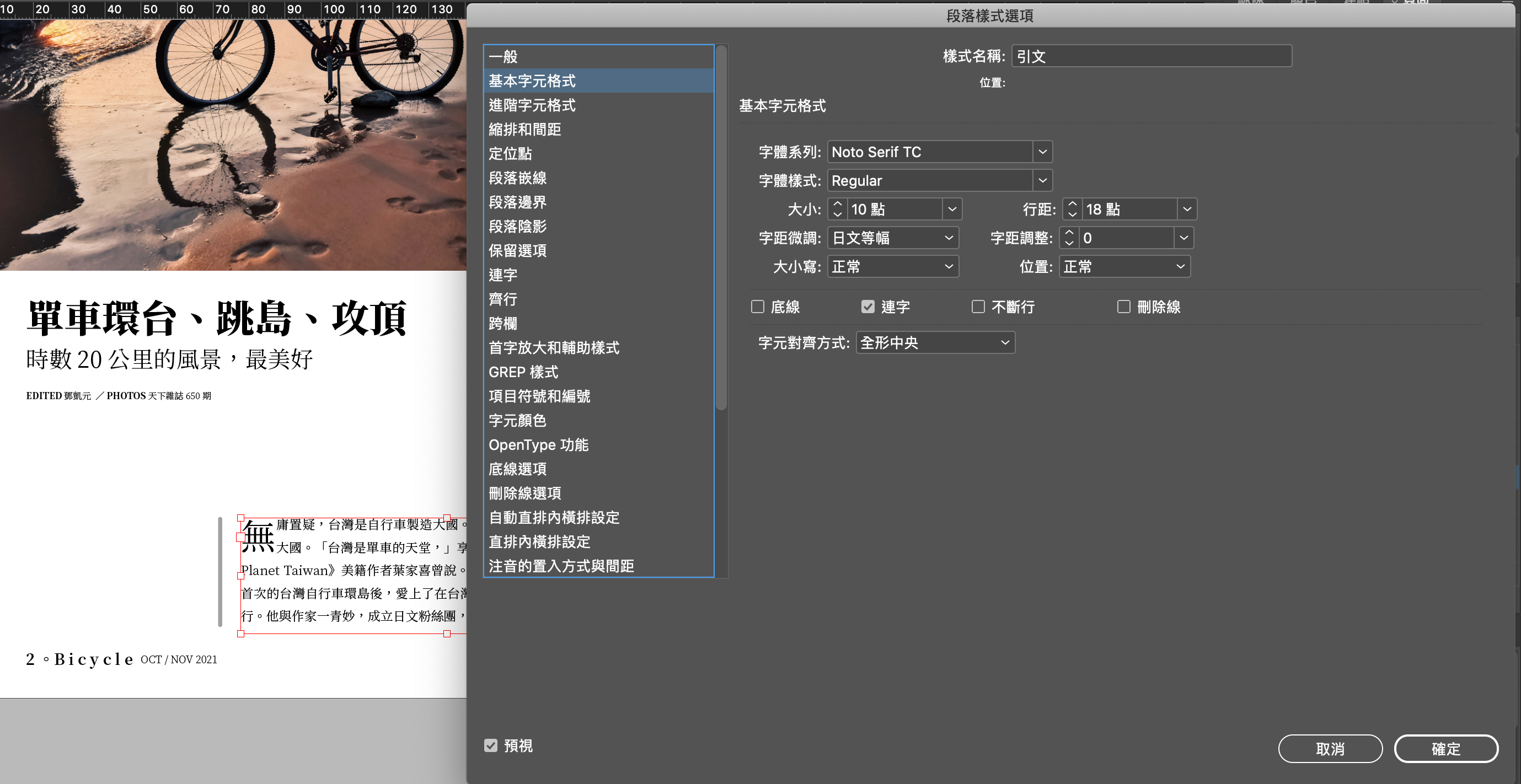 - 拉文字框,輸入文章引言,設定『段落樣式』>『引言』的『基本字元格式』內容