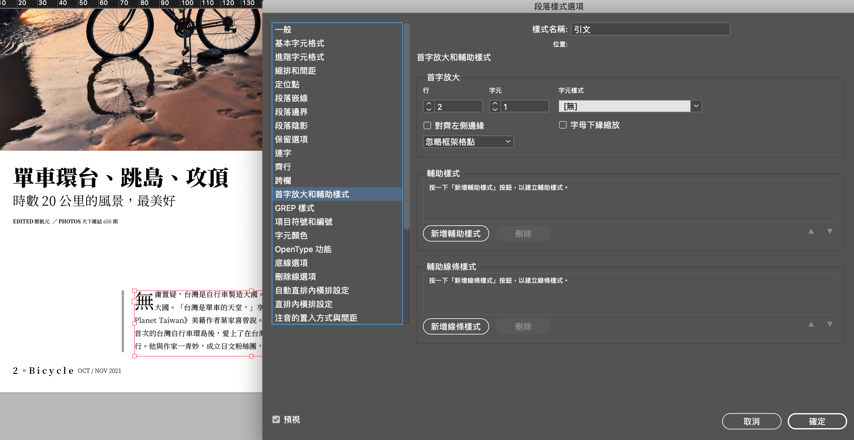 - 設定『段落樣式』>『引文』的『字首放大和輔助樣式』內容