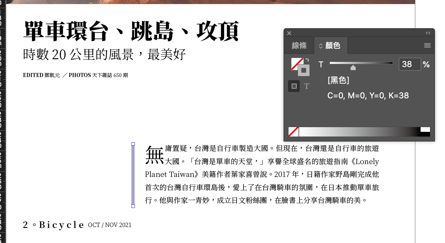 請陸續準備好期末作業的內容,包含文章、照片、圖片等資訊,文章及圖片請盡量為原創,若引用自其他地方,請列出資料來源,並為授權圖片。 本範例,文字來源:天下雜誌650期 之部分內容,照片取自免費圖庫網站:unsplash ,下圖為本單元之兩頁短文章之範例,包含:主版設定、頁碼、文章標題、副標題、主圖、內文、段落樣式、字元樣式等設定。