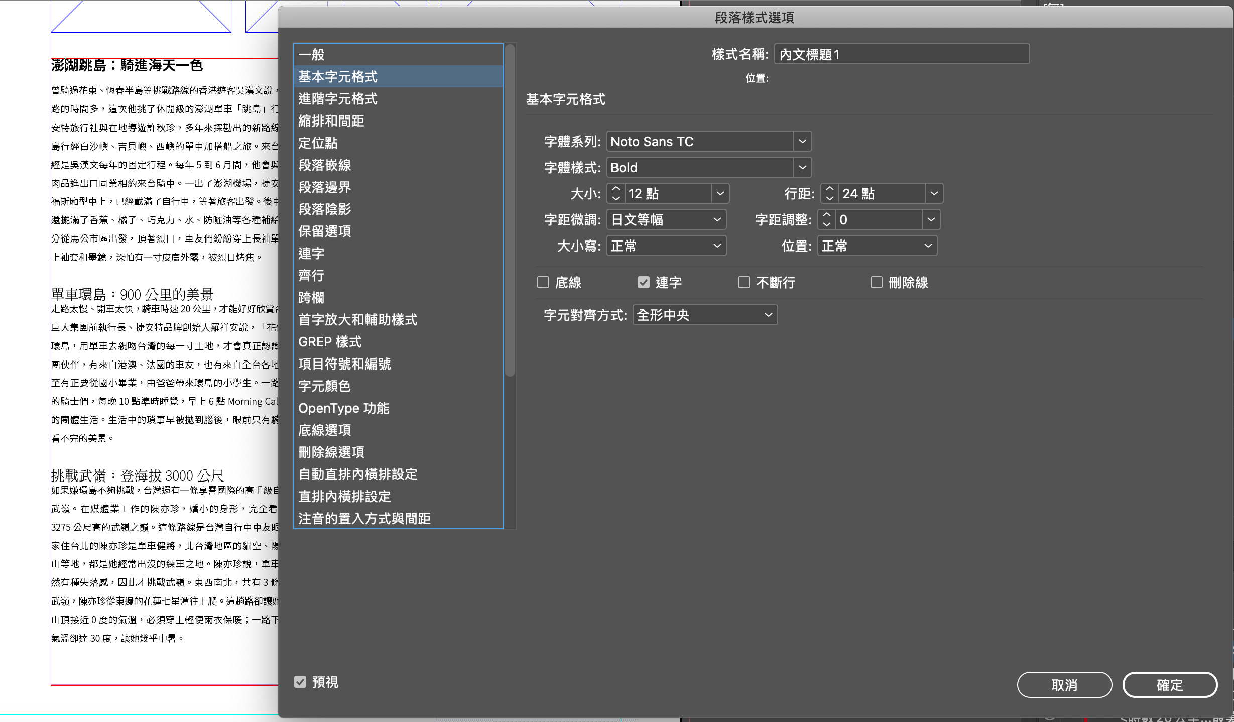- 設定『內文標題1』的『段落樣式』--『基本字元格式』內容。 並套用至內文標題,預覽效果。