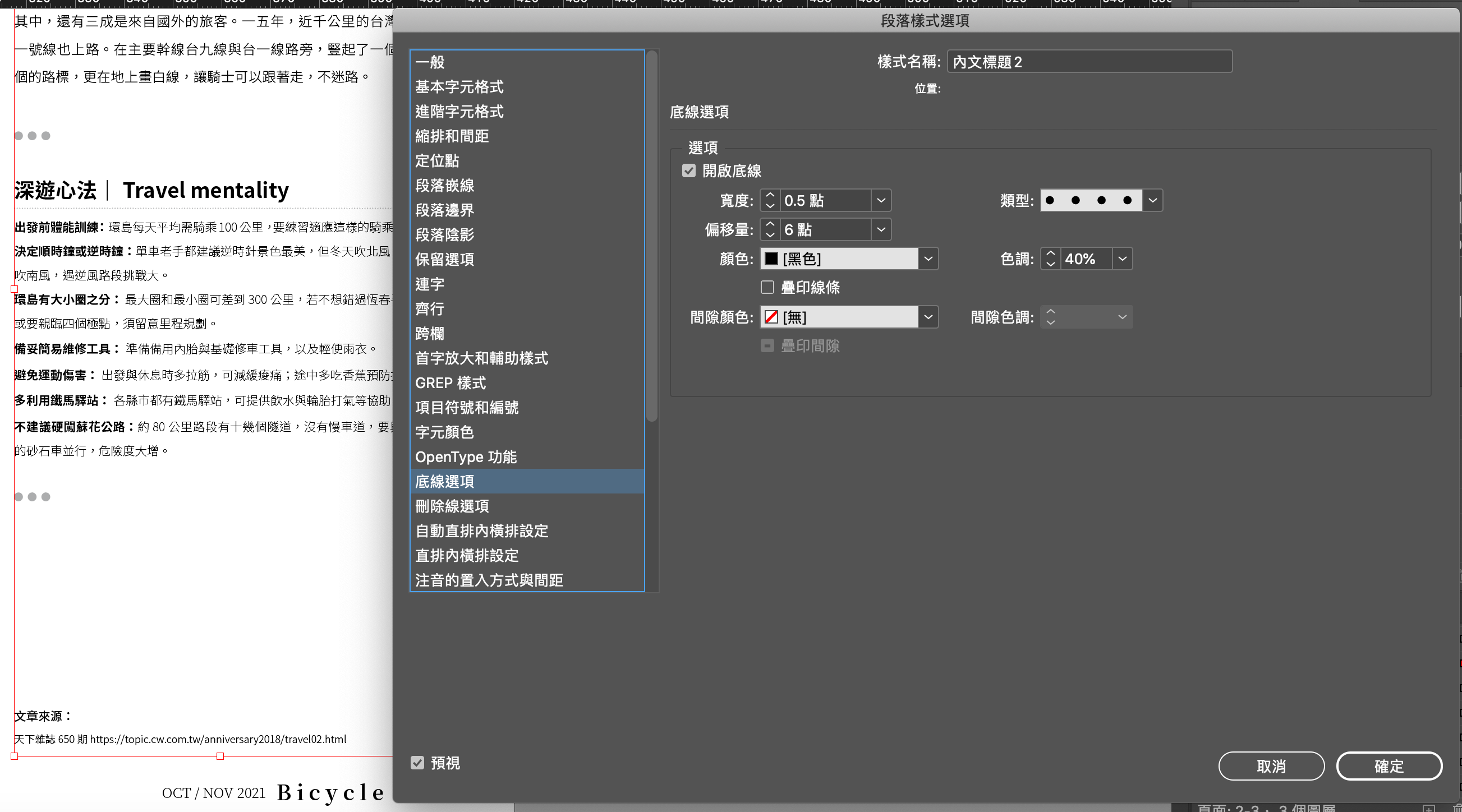 - 設定『內文標題2』的『段落樣式』--『底線選項』設定。形成稍有變化之標題設定。