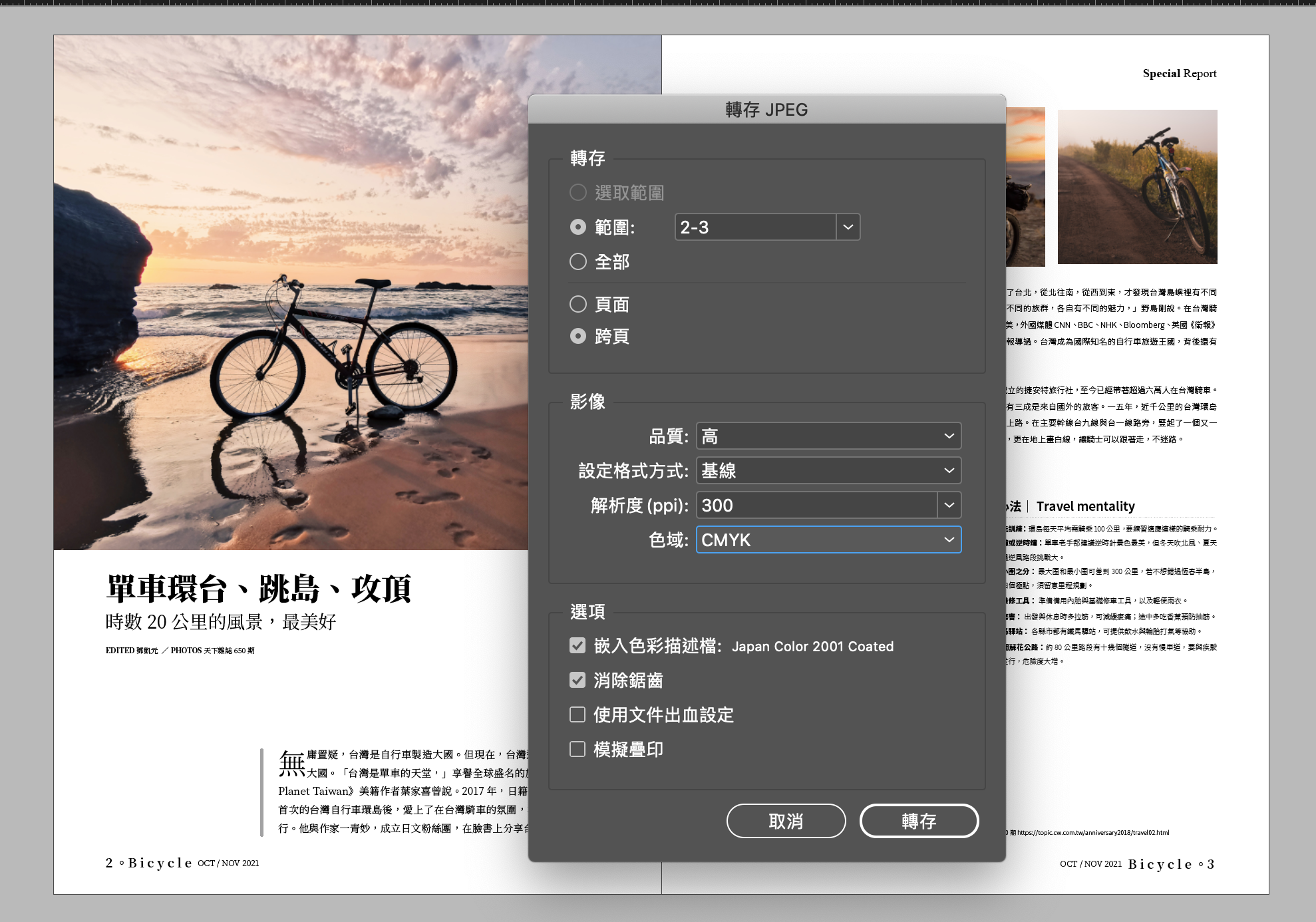 - 範圍:2-3頁,跨頁,高品質,設定解析度為『300』>『色域』為CMYK。
