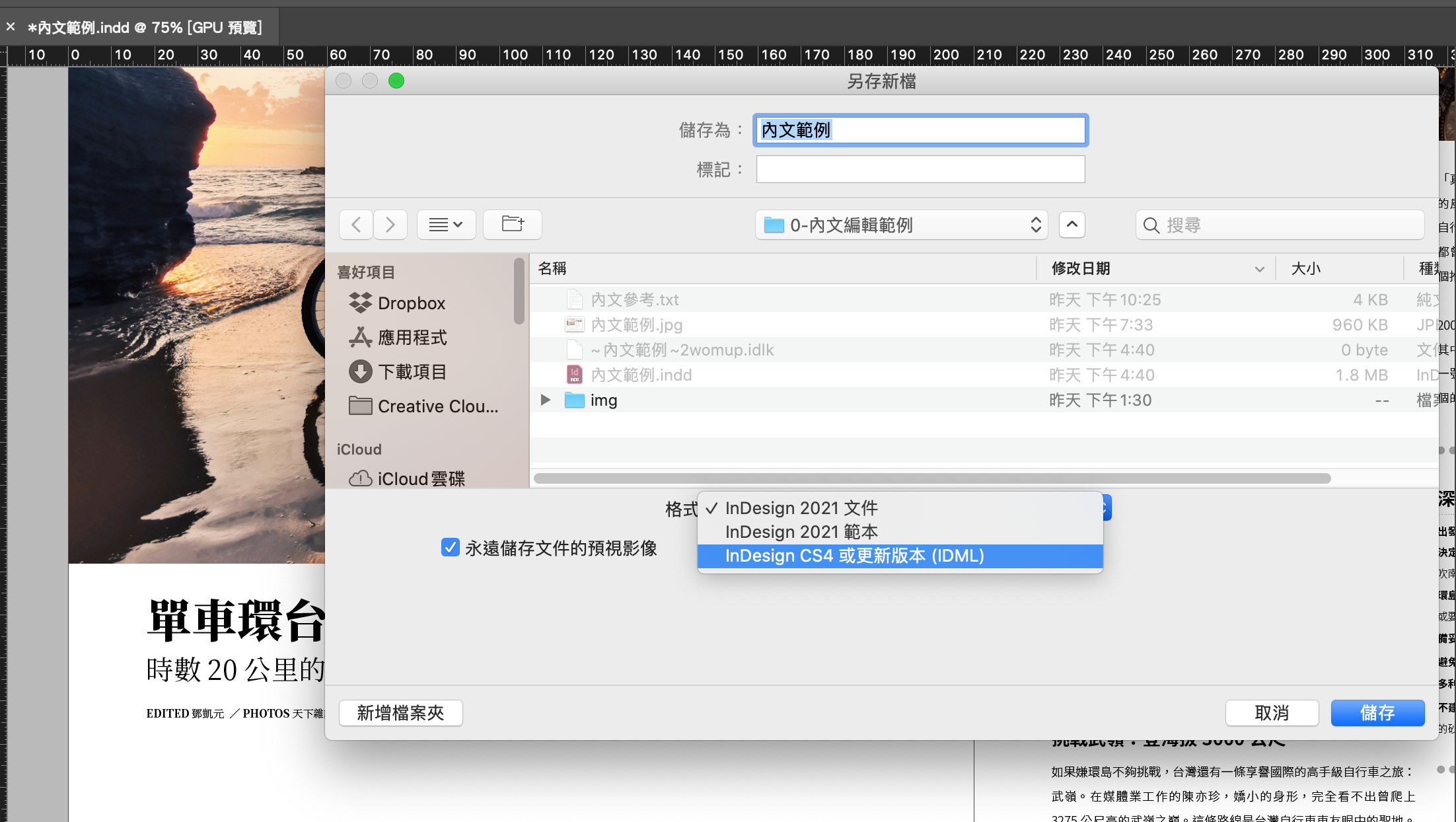 - 『檔案』>『另存新檔』可降轉為『IDML』格式,可供較低階的軟體讀取。