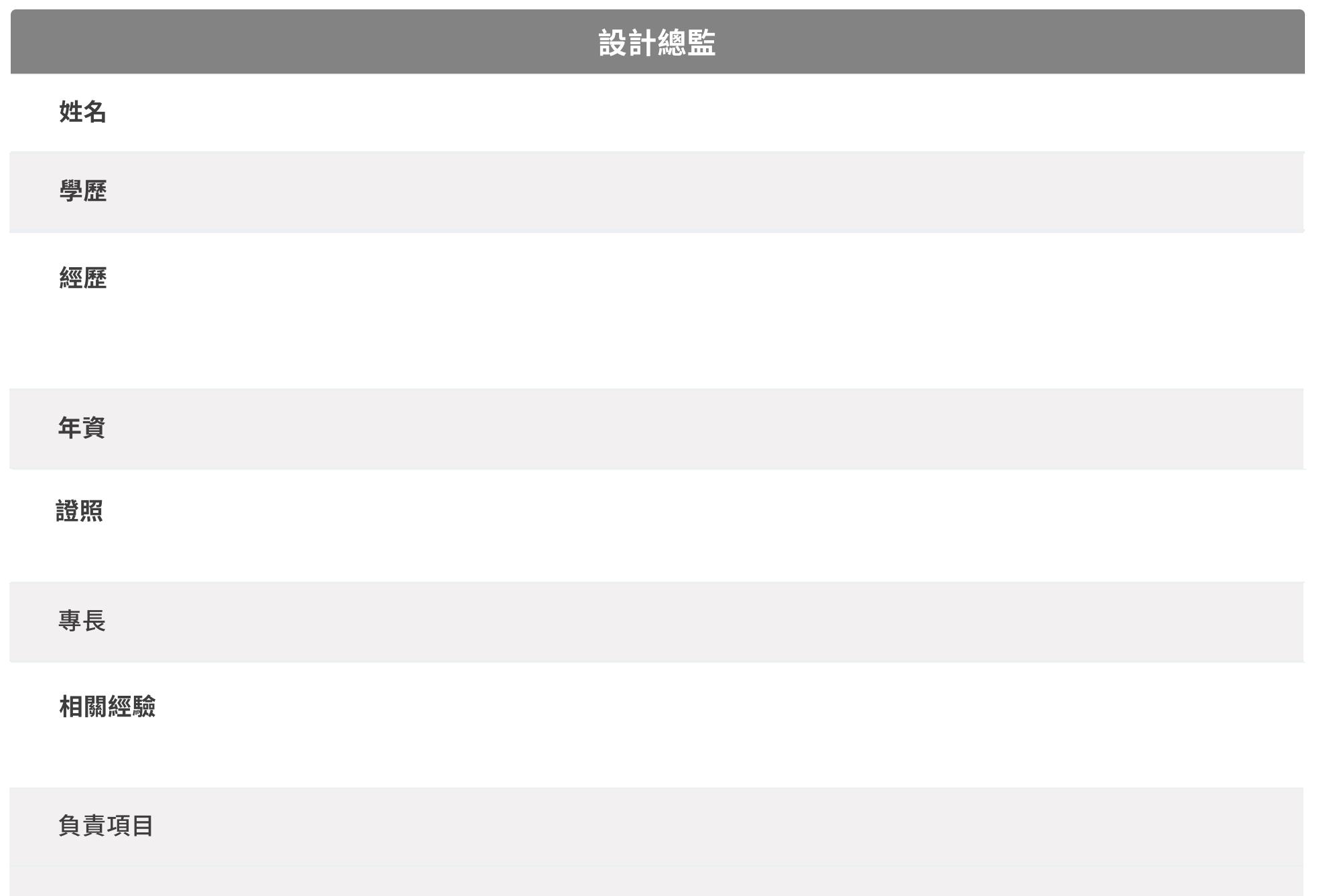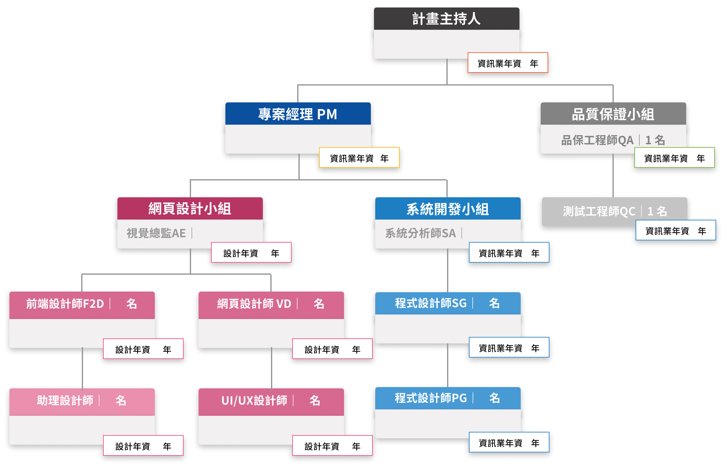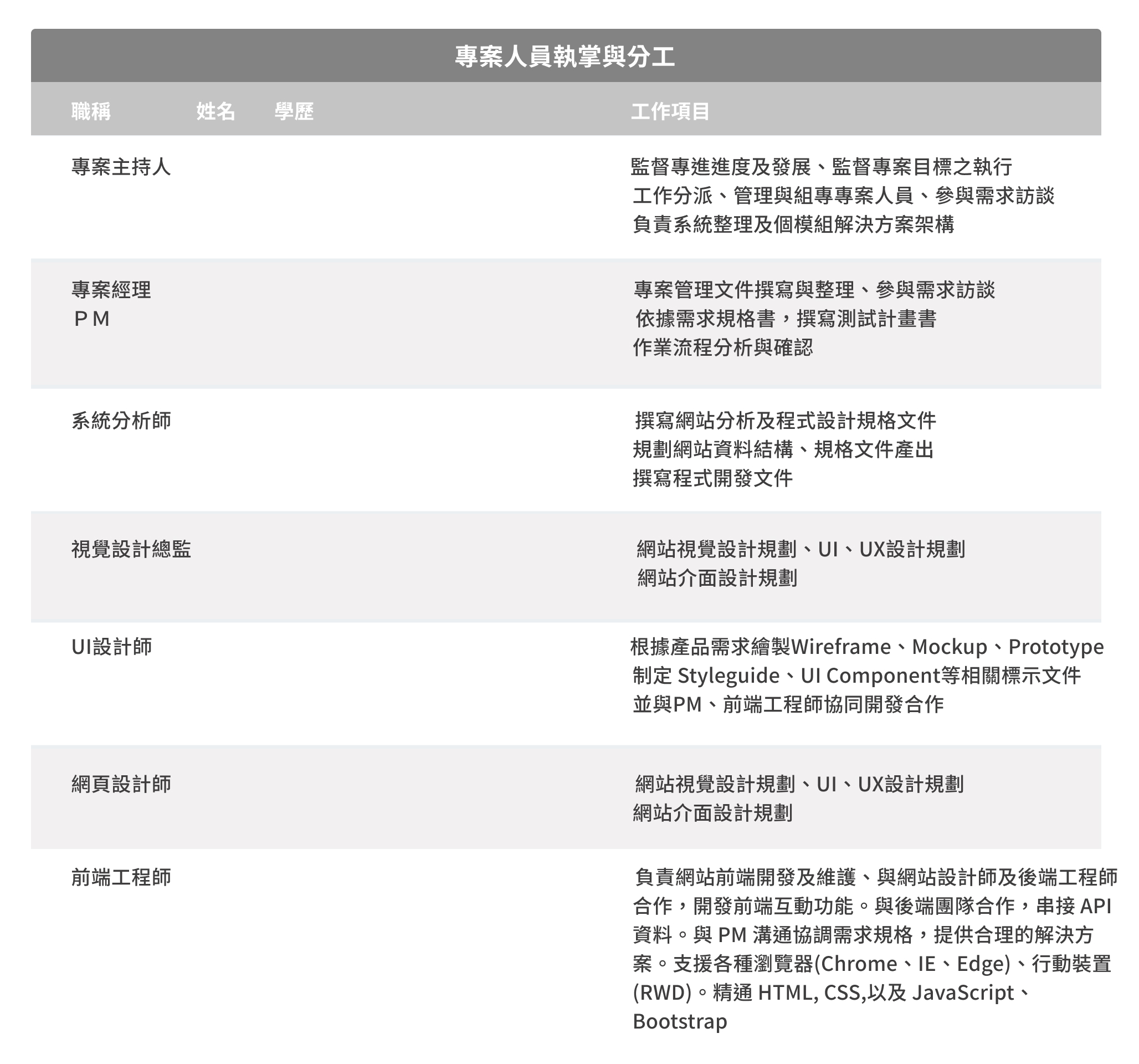 - 專案組織架構、職掌與分工(含專案各成員之學經歷與年資)。