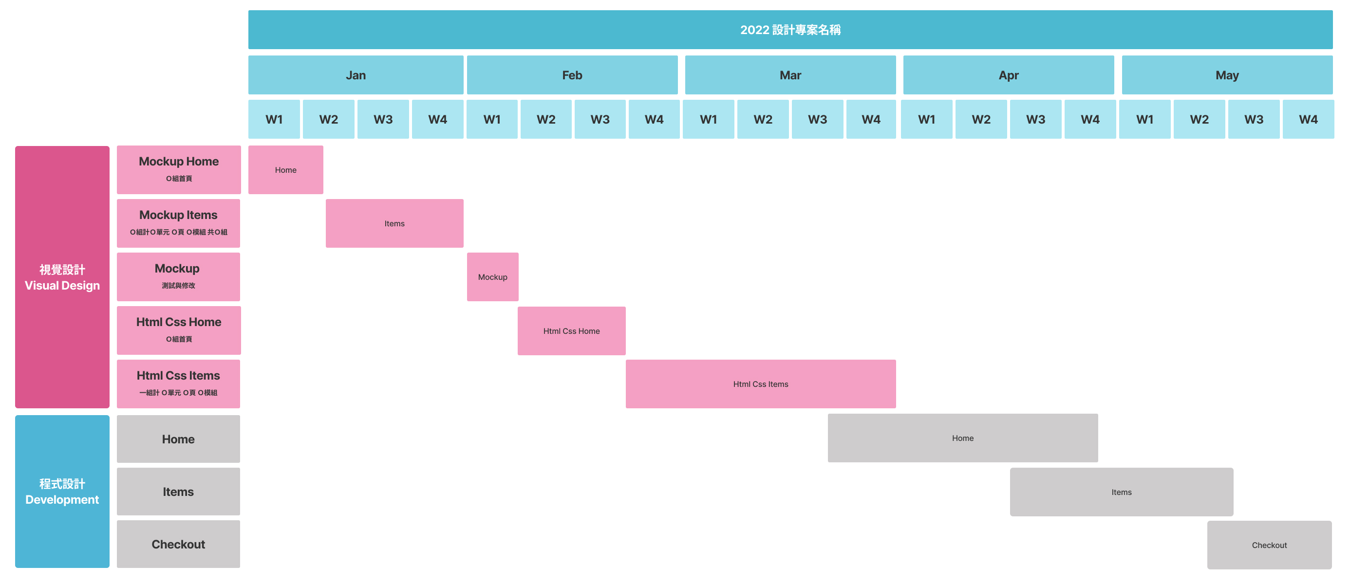 一般的標案提出需求後,約一到兩個禮拜要提出服務建議書,並於3-7天左右簡報,時程非常的緊湊,除了需提出規劃建議外,還需要提出基本的視覺規劃,包含首頁、基本模組化視覺設計等,因此多練習及累積作品是非常重要的,也期待大家在專案設計的實務練習中,能讓自己更具專業實務能力。
