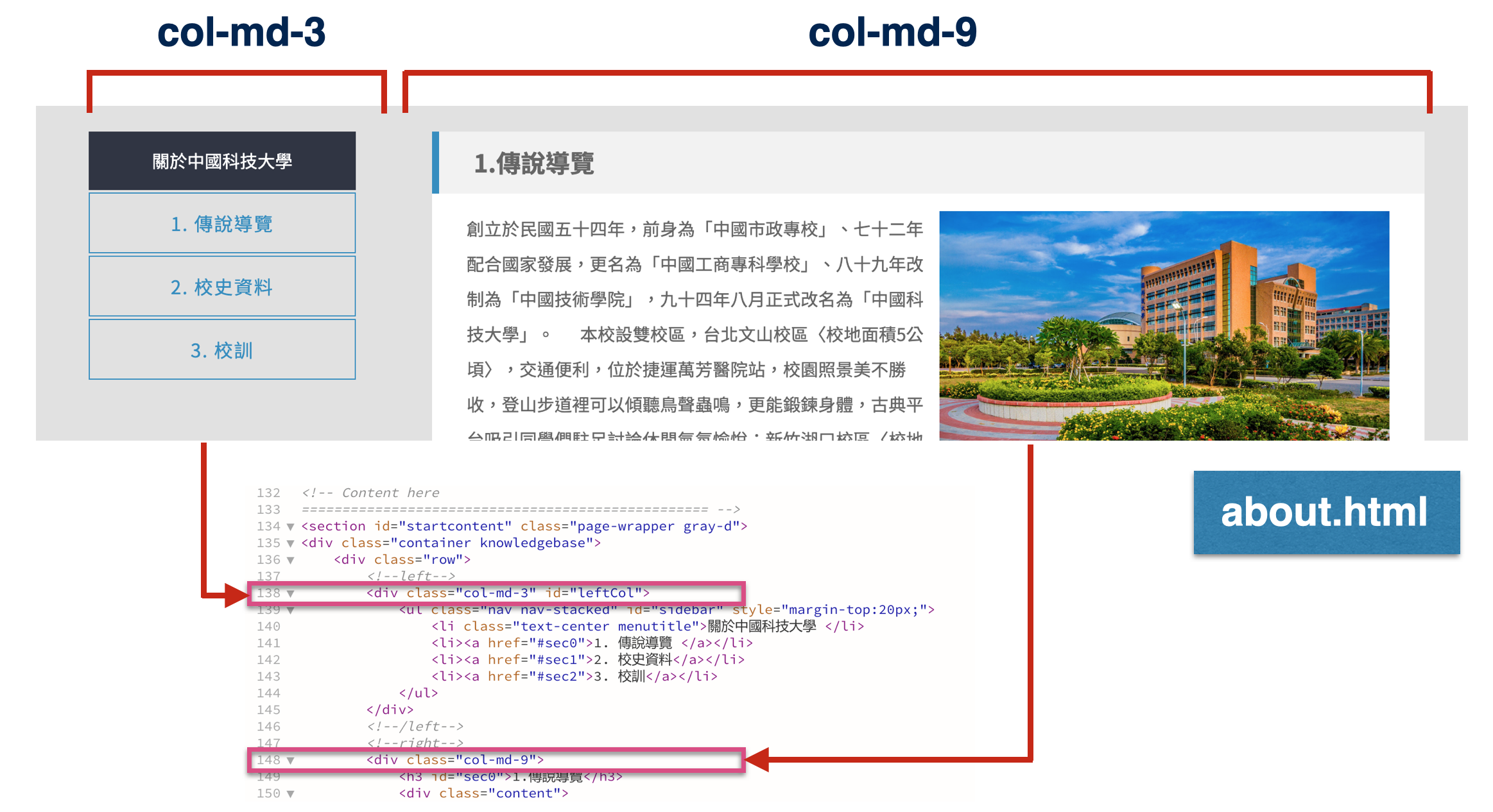 本範例採雙欄式設計,左側為分類選項標題,右側為相對應之內容,分別為col-md-3,col-md-9,兩欄之數字及比例可自行調整分配,加總為12即可。