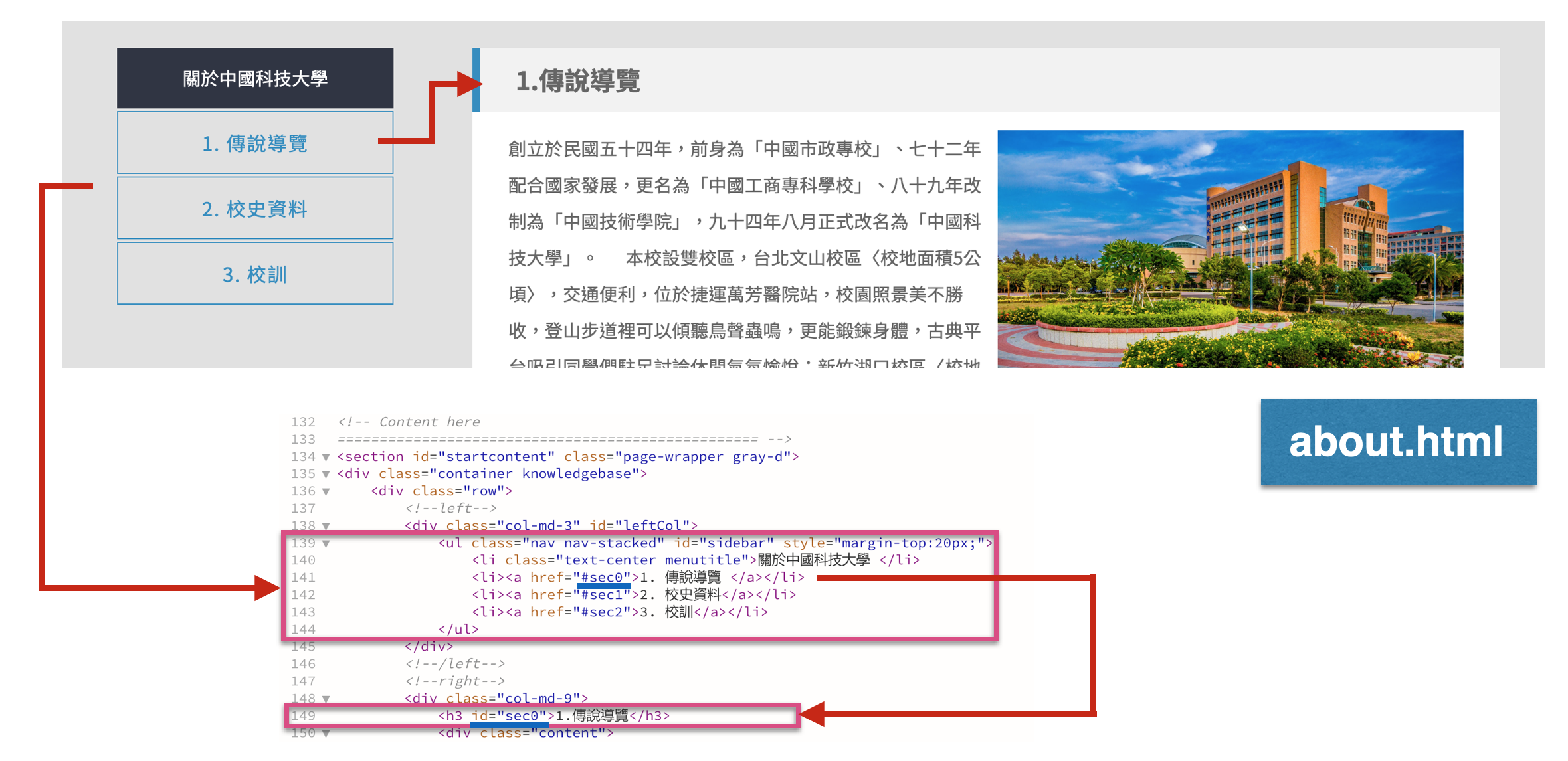 左側標題導覽列以<ul><li>項目清單製作,並以錨點連結的方式,將左側標題與右側內容做對應連結,如第一個標題1.傳說導覽,連結到 #sec0 ,對應內容之 id=“sec0” 。