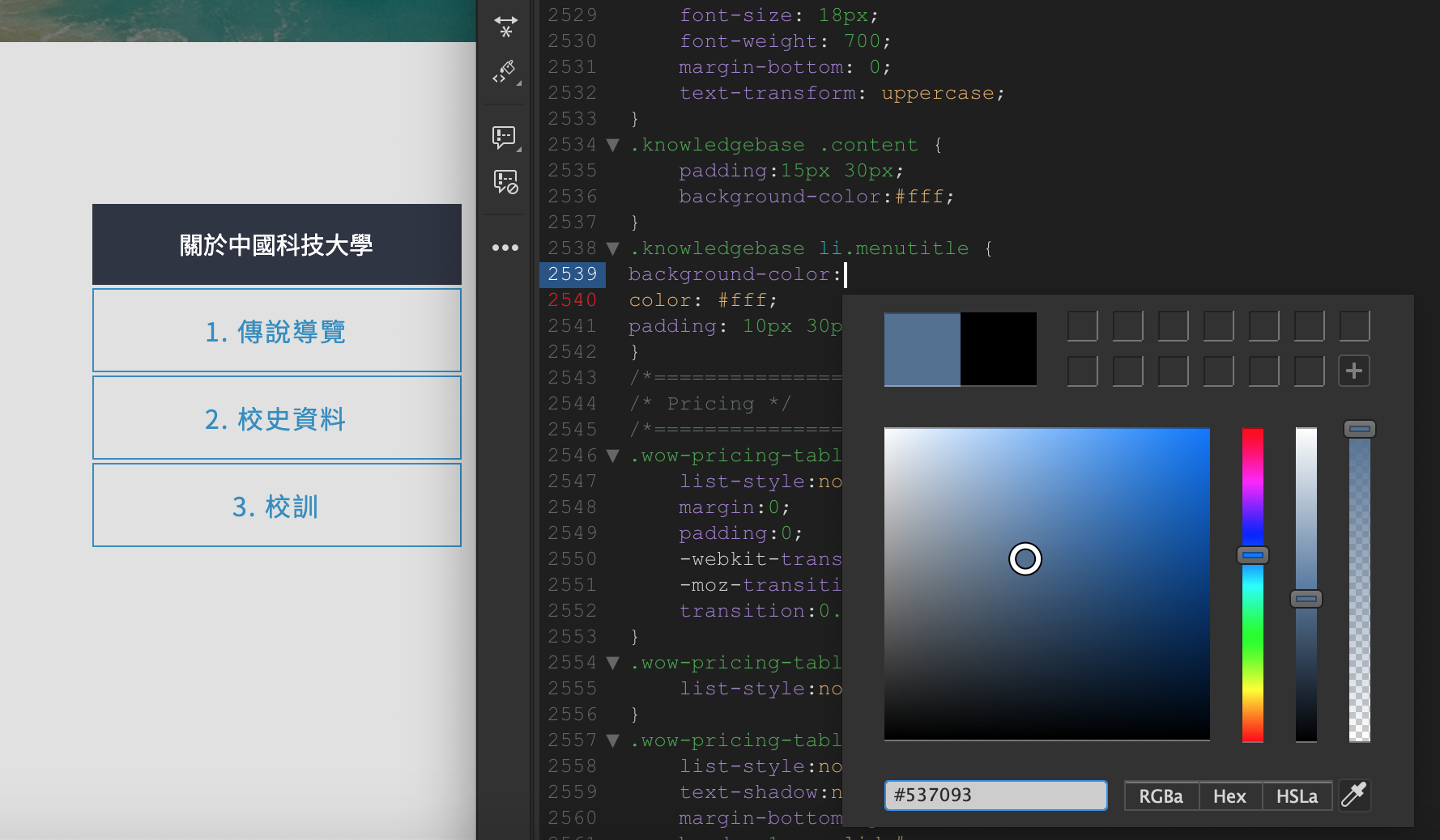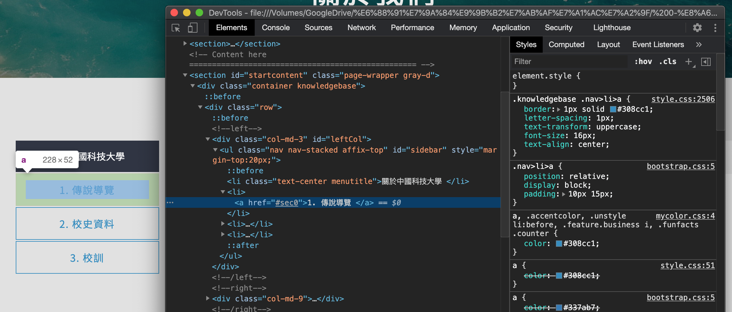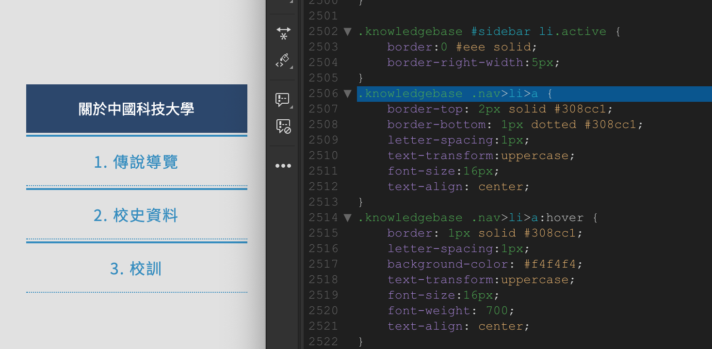 查看about.html中,導覽標題的設定為class knownledgebase,則可至style.css搜尋設定位置,並加以修改超連結標題以及滑鼠移過去之效果。