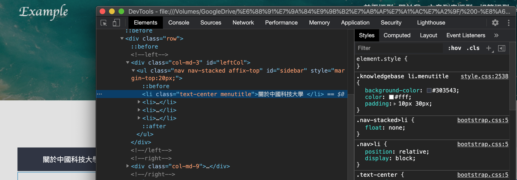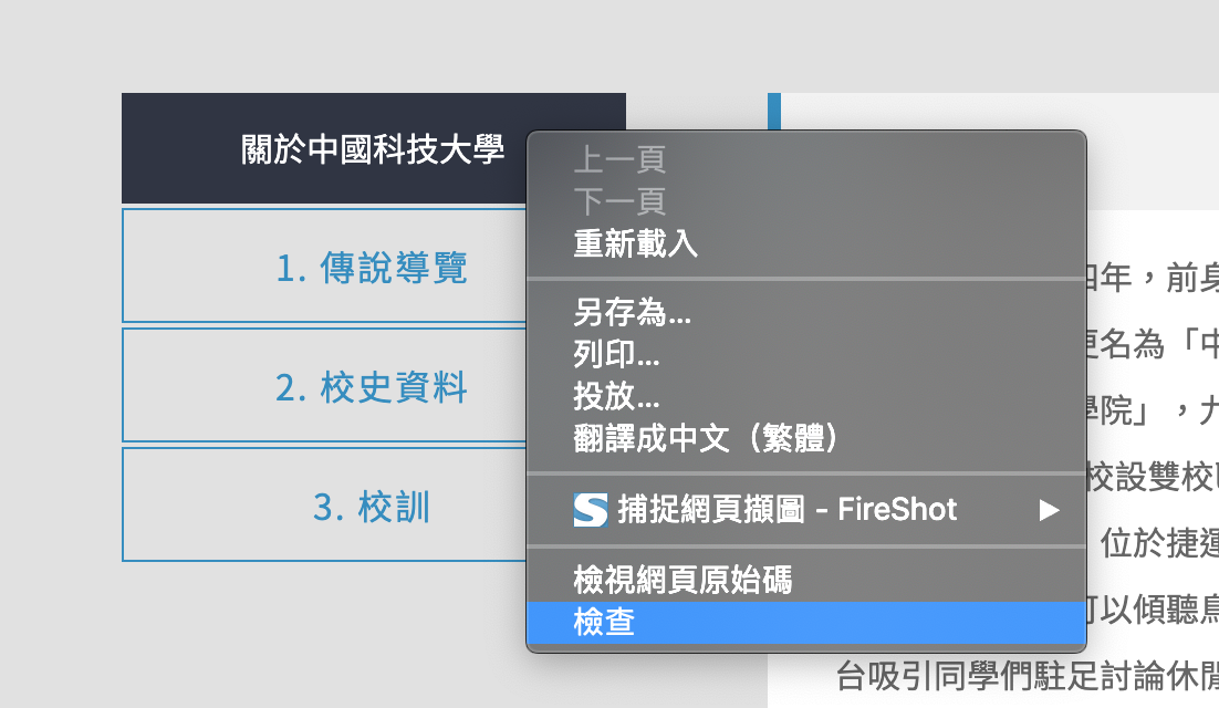 也可在網頁預覽狀態,在欲修改之項目中,按右鍵選擇『檢查』,即可查看css之檔案與行數,進入style.css中修改。