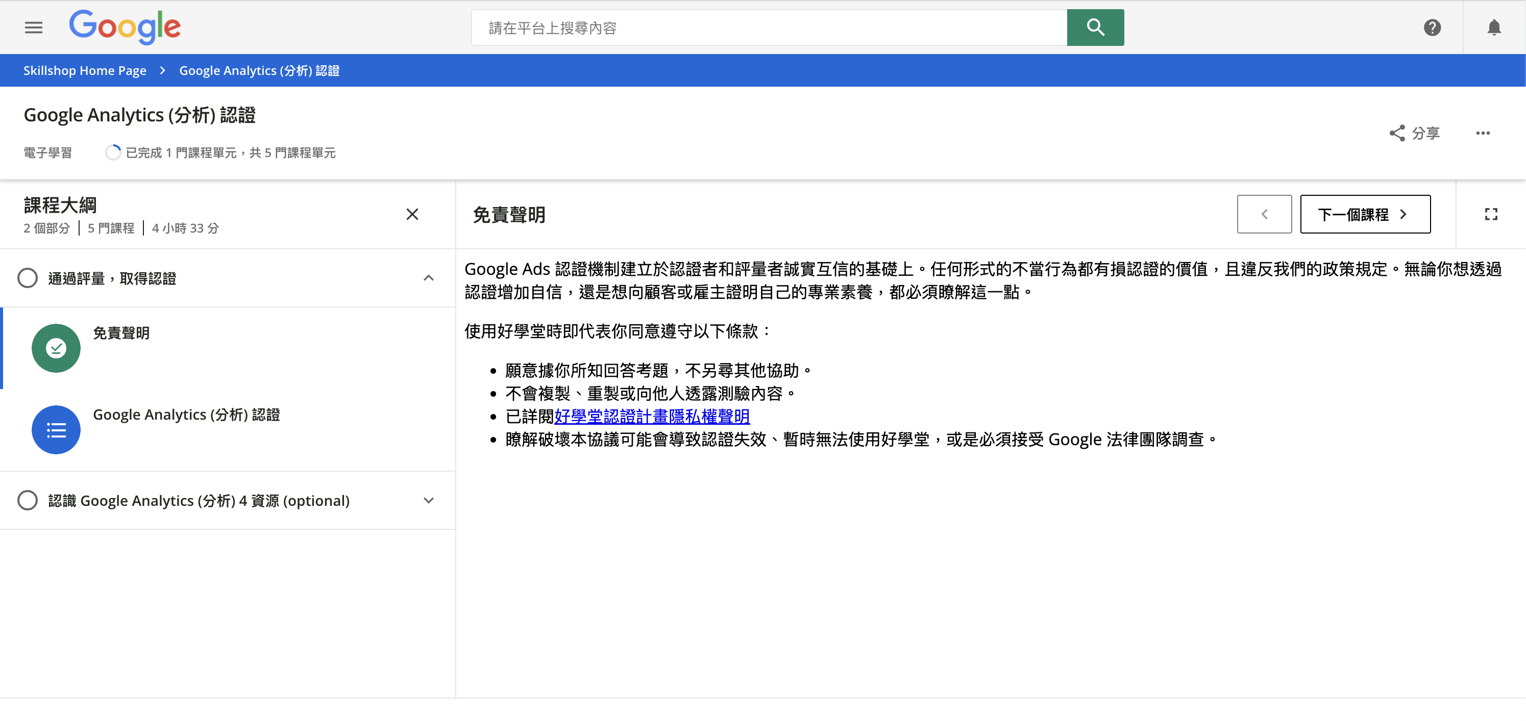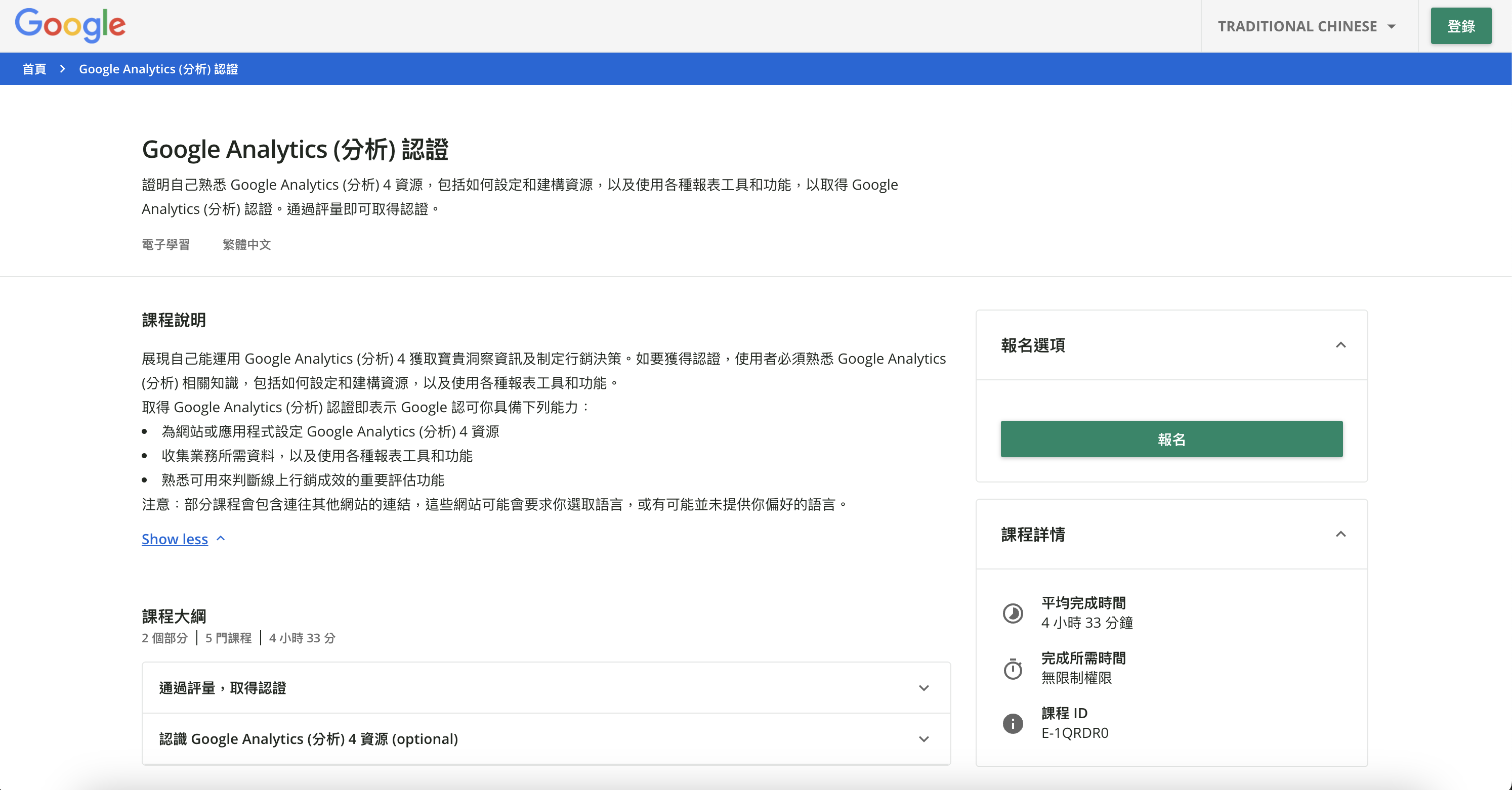 - [GA4] 報名好學堂的 Analytics 學習中心課程 Google Analytics (分析) 個人認證測驗涵蓋 Google Analytics (分析) 的多項基礎及進階概念,包括規劃與原則、實作與資料收集、設定與管理、轉換和歸屬,以及報表、指標與維度。