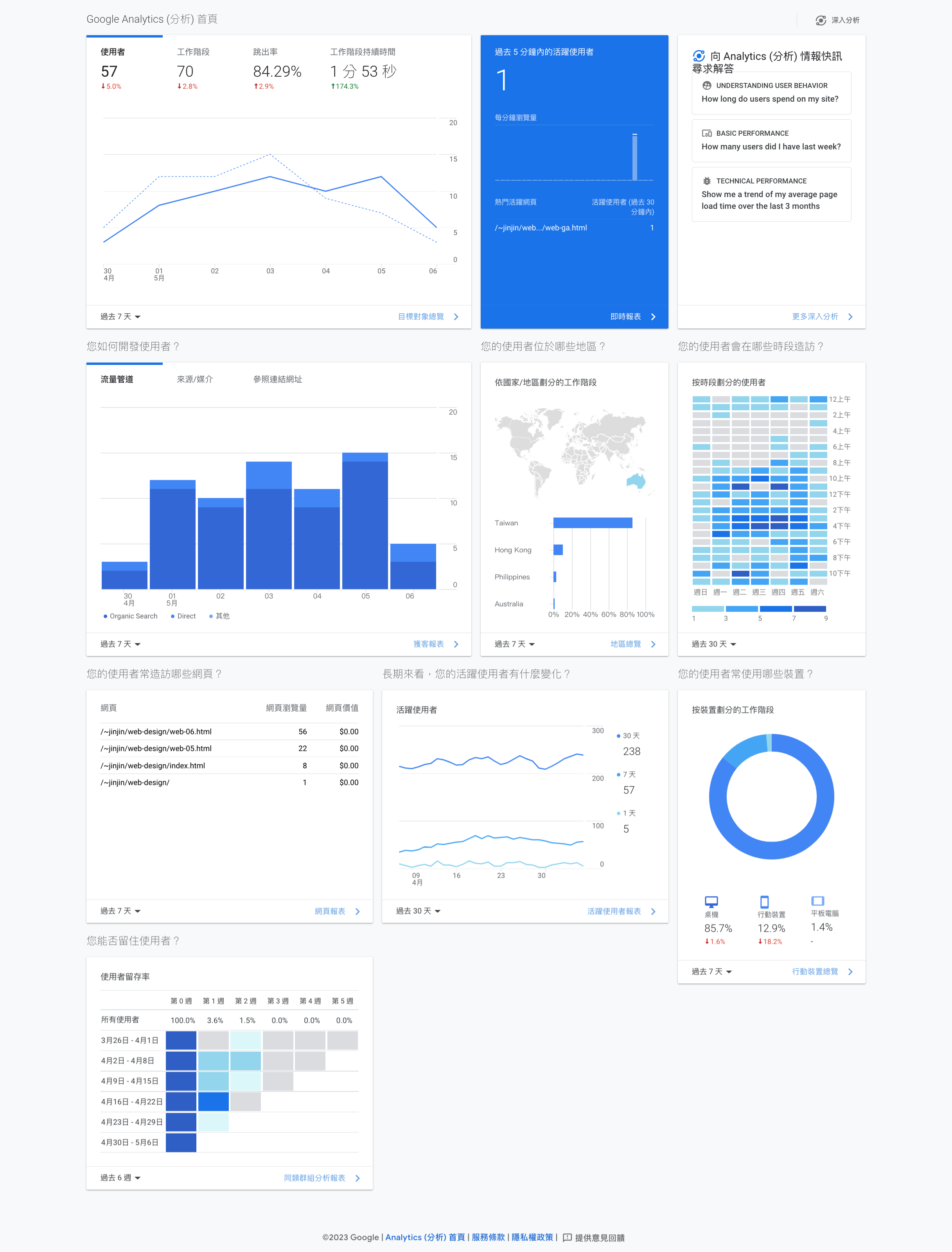 Google分析(Google Analytics)是一個由Google所提供的網站流量統計服務。Google 分析(Analytics)現在是網際網路上使用最廣泛的網路分析服務。透過在網站中埋入Google Analytics追蹤碼,網站主們可以獲取進站流量的資料,包括來源、使用者、裝置、造訪路徑等,透過Google Analytics,可以更全面的了解品牌的受眾,進而為潛在客戶優化購買、造訪流程,提高轉單意願,對於網頁入門來說是非常推薦使用的工具。